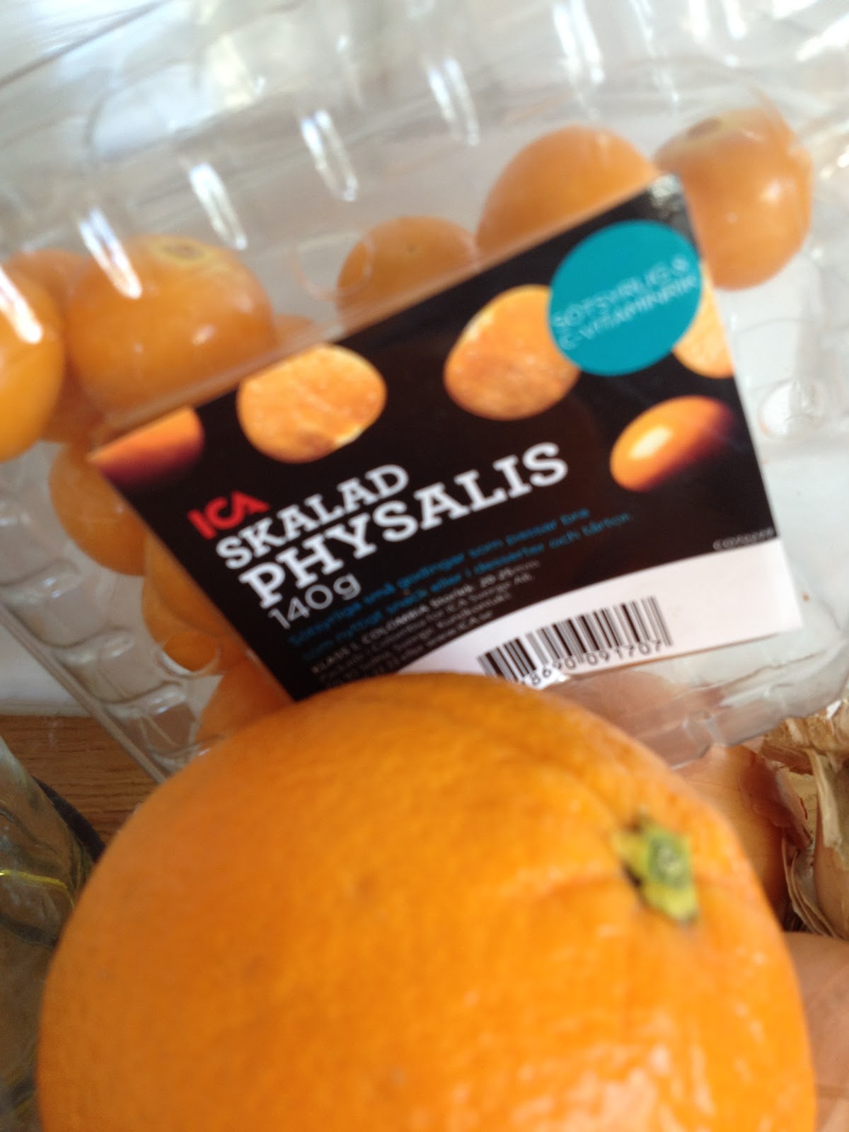 För att försöka undvika en förkylning så långt det går vitaminboostar jag mig själv lite extra idag. Physalis är rik på både C- och A-vitamin och apelsiner är ju som bekant bra C-vitaminbomber. Visste ni förresten att physalis är ett bär som tillhör samma växtfamilj som potatisen?