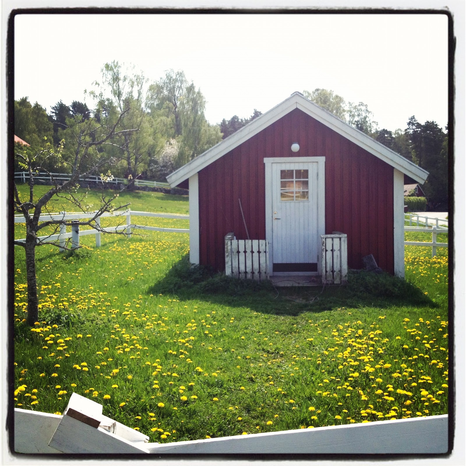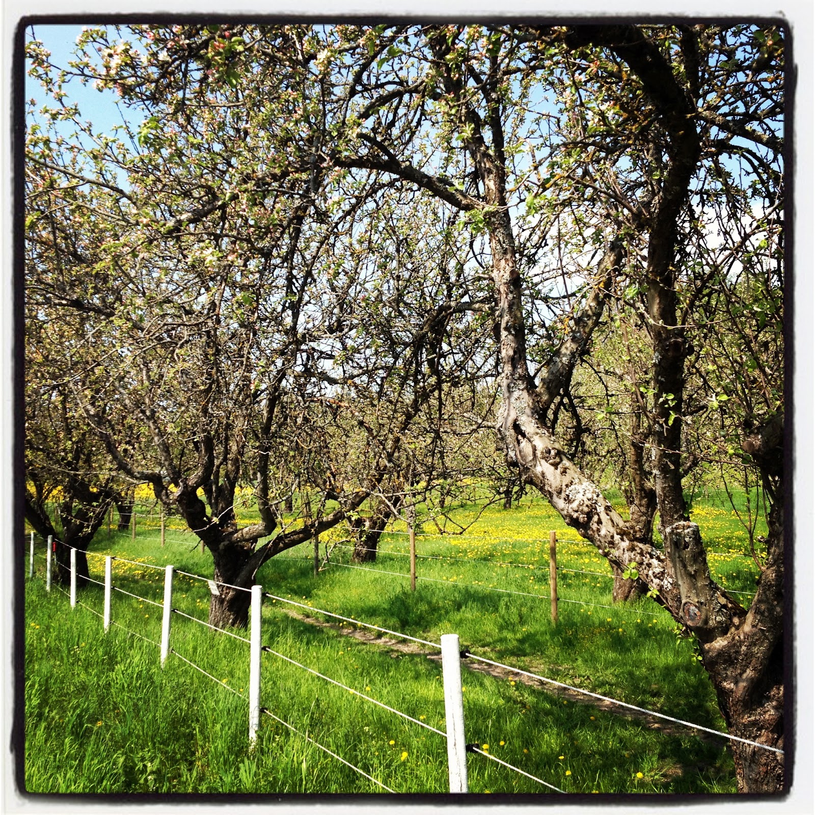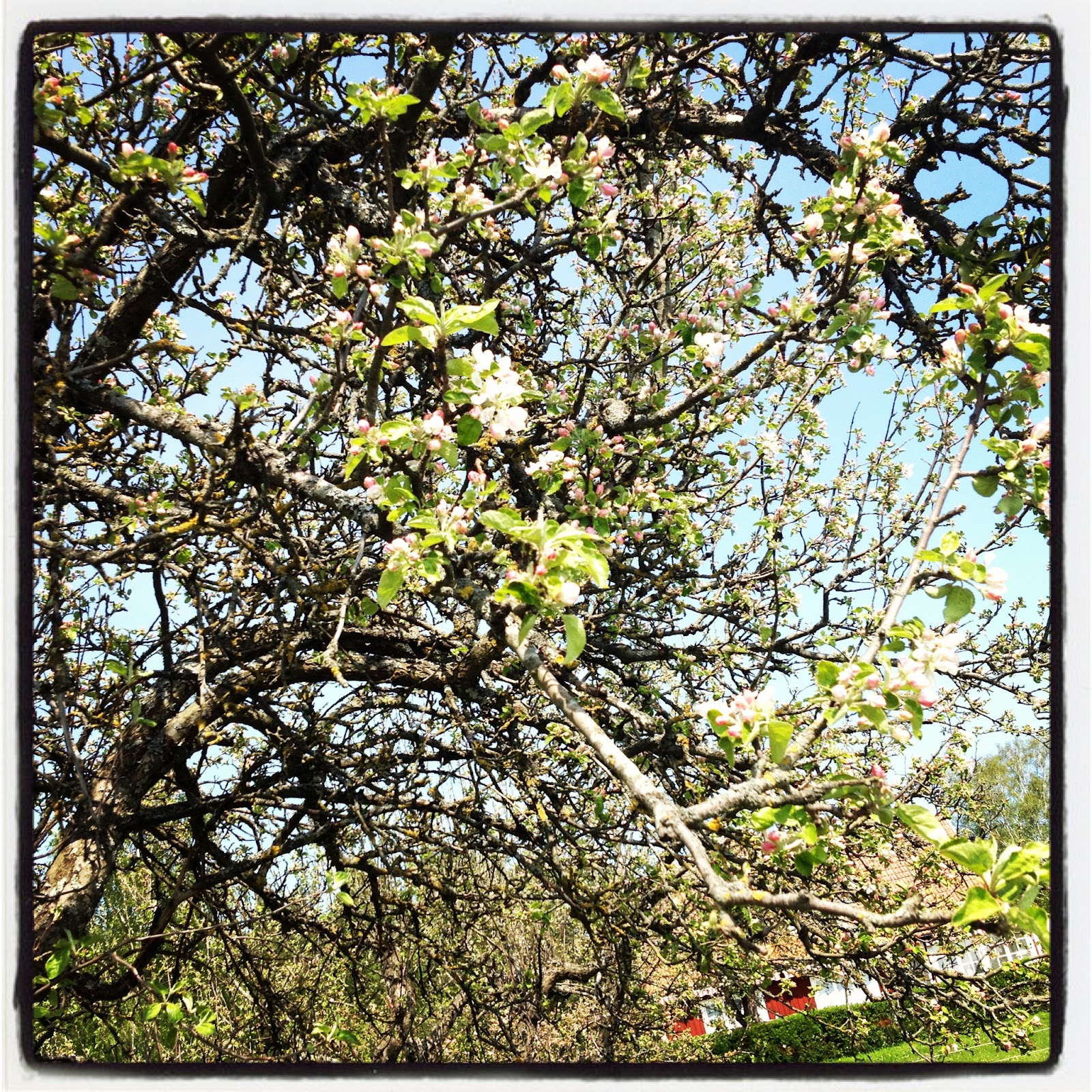 Fyra kilometer från vårt hem finns det nämligen ett häststall. Jag brukar gå eller springa förbi det ganska ofta, men jag har aldrig varit i området runt omkring stallet. Nu har jag det. För det var där vi promenerade idag. Miljöerna kring stallet var väldigt fina och lantliga. Där fanns stora ängar och hagar. En del med hästar, en del med växter. Där fanns röda små stugor och större ladugårdar. Och där fanns många gamla äppelträd som stod i blom.