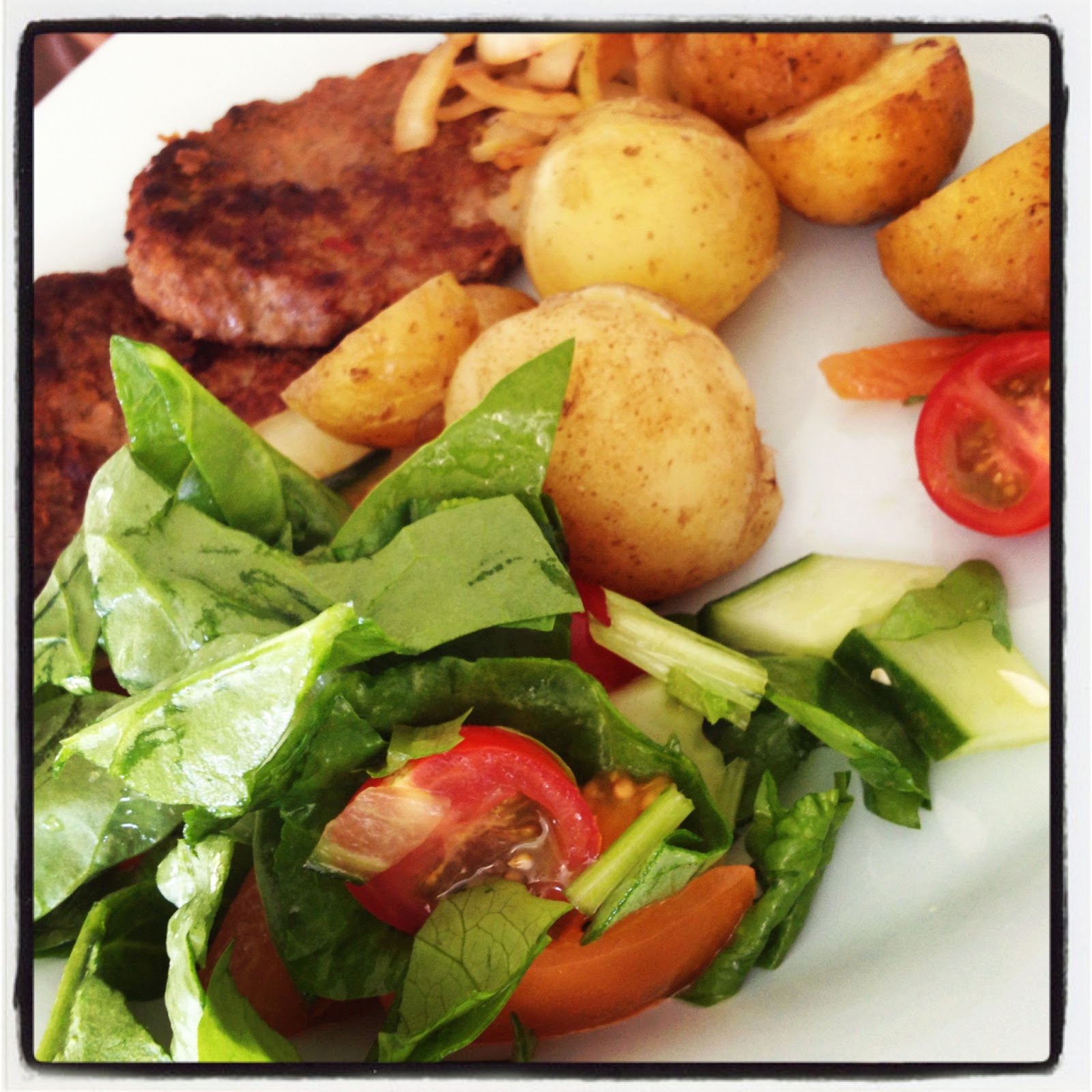 Dagens lunch med pannbiffar, kokt färskpotatis, stekt lök och den grymt goda salladen med egen sallad och spenat var mycket god. Vi har massor med sallad och spenat kvar så vi kommer kunna njuta av detta flera måltider framöver!