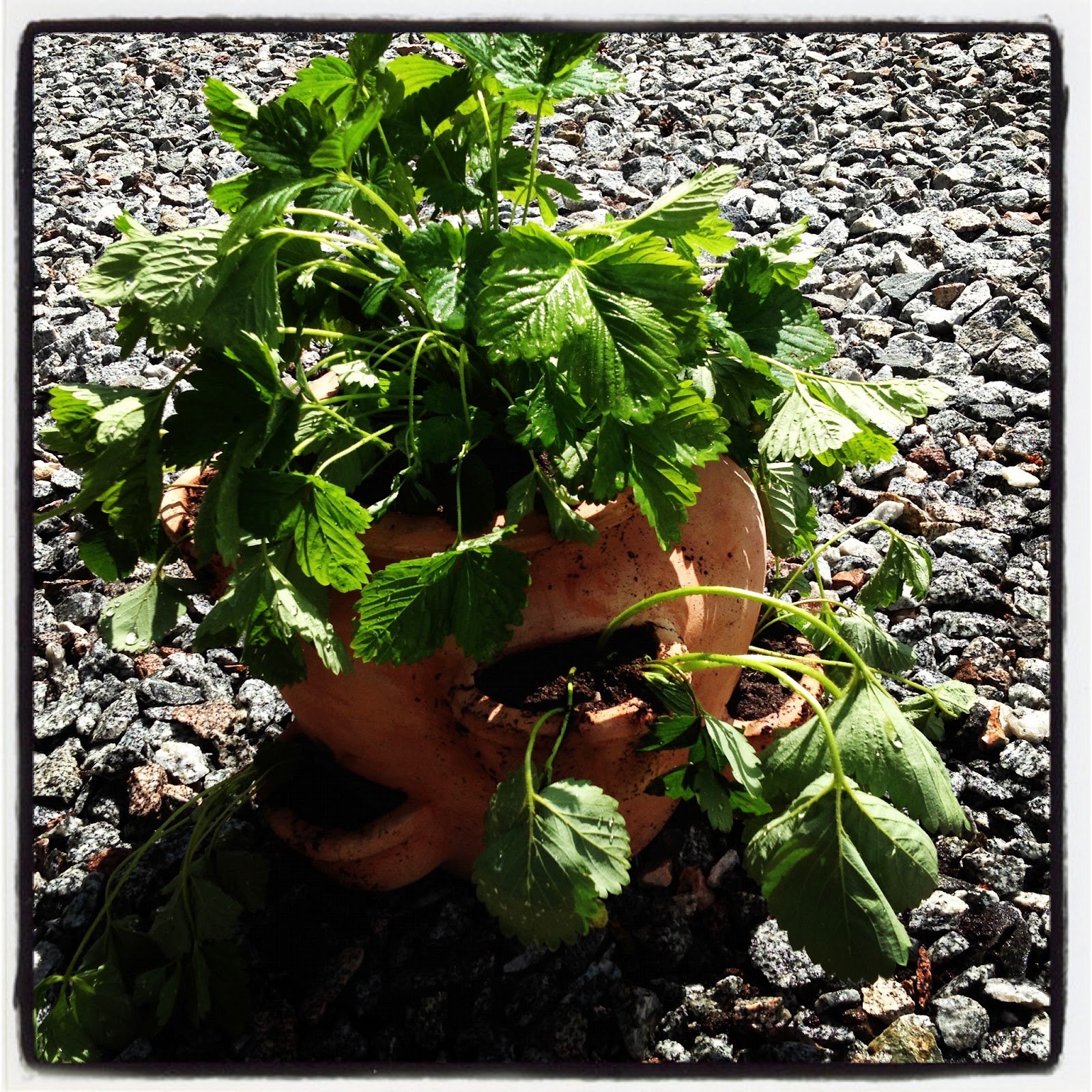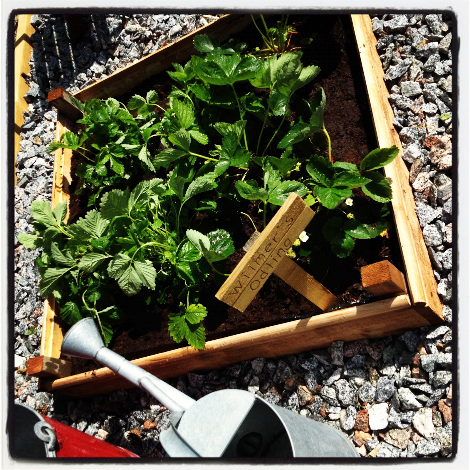 I Wilmers odling har jordgubbs- och smultronplantorna växt sig stora så jag planterade om där lite idag. De plantor som hamnade i krukan ser dessvärre lite ledsna ut. Hoppas att de tar sig!
