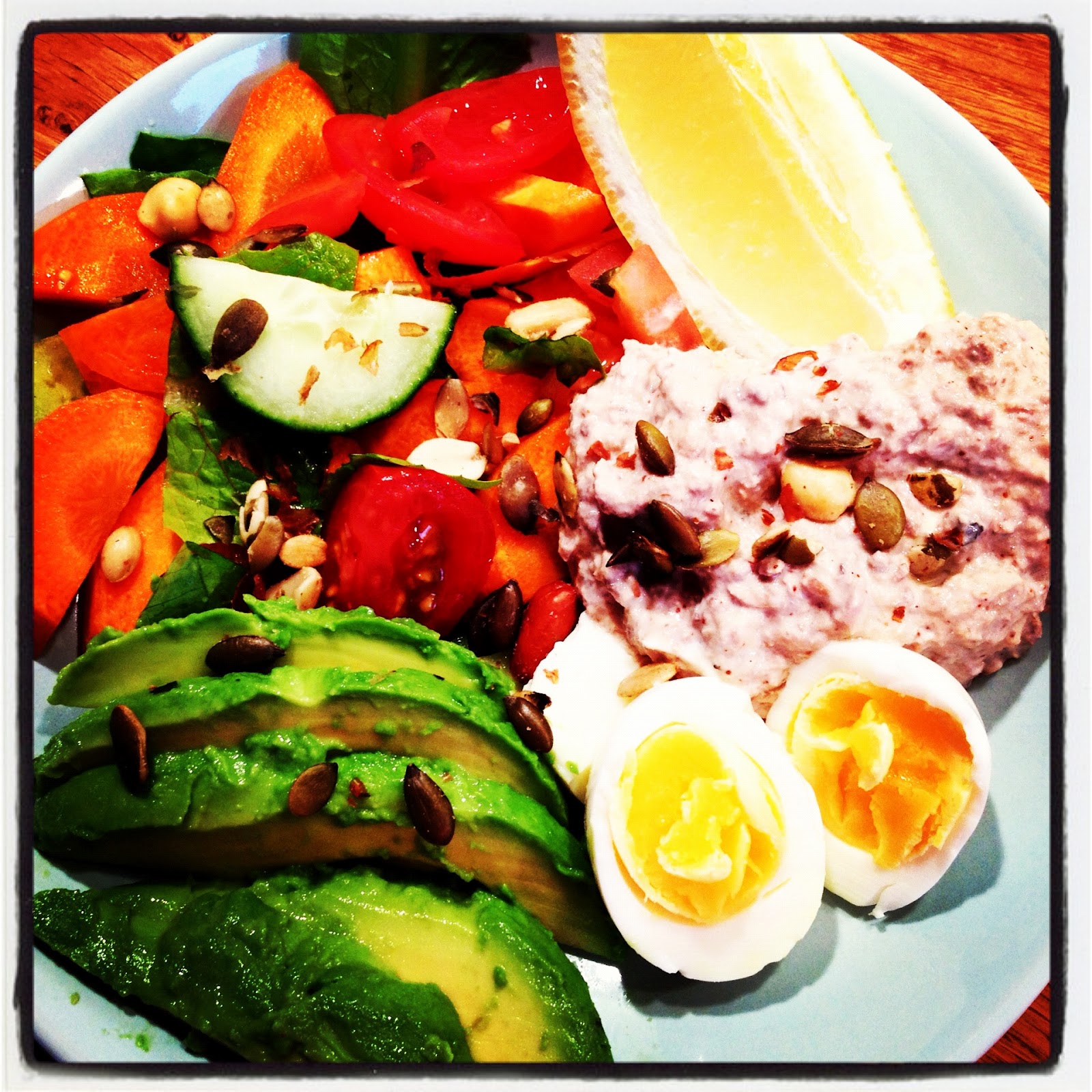 Kvällens tonfiskröra gjorde jag som denna, men jag hade inga svarta oliver i. Jag åt den med avokado, kokt ägg (igen!), grönsaker och nötter.