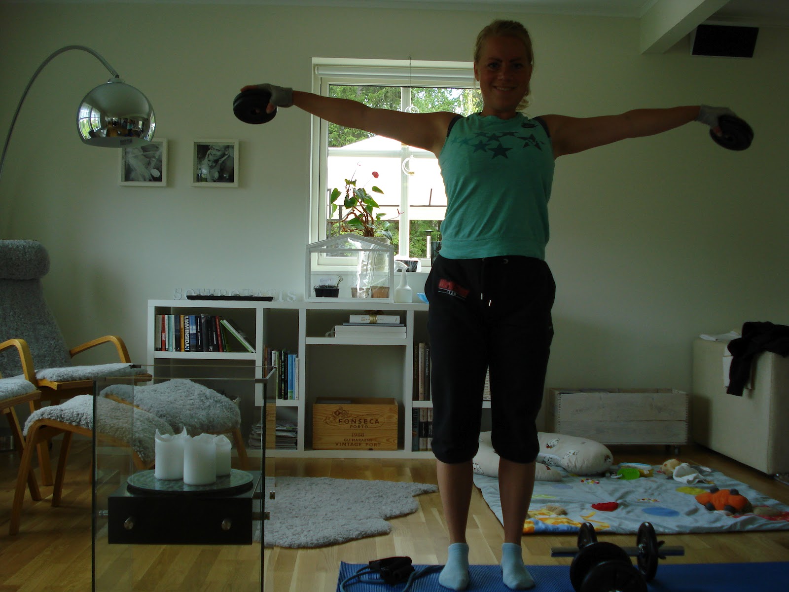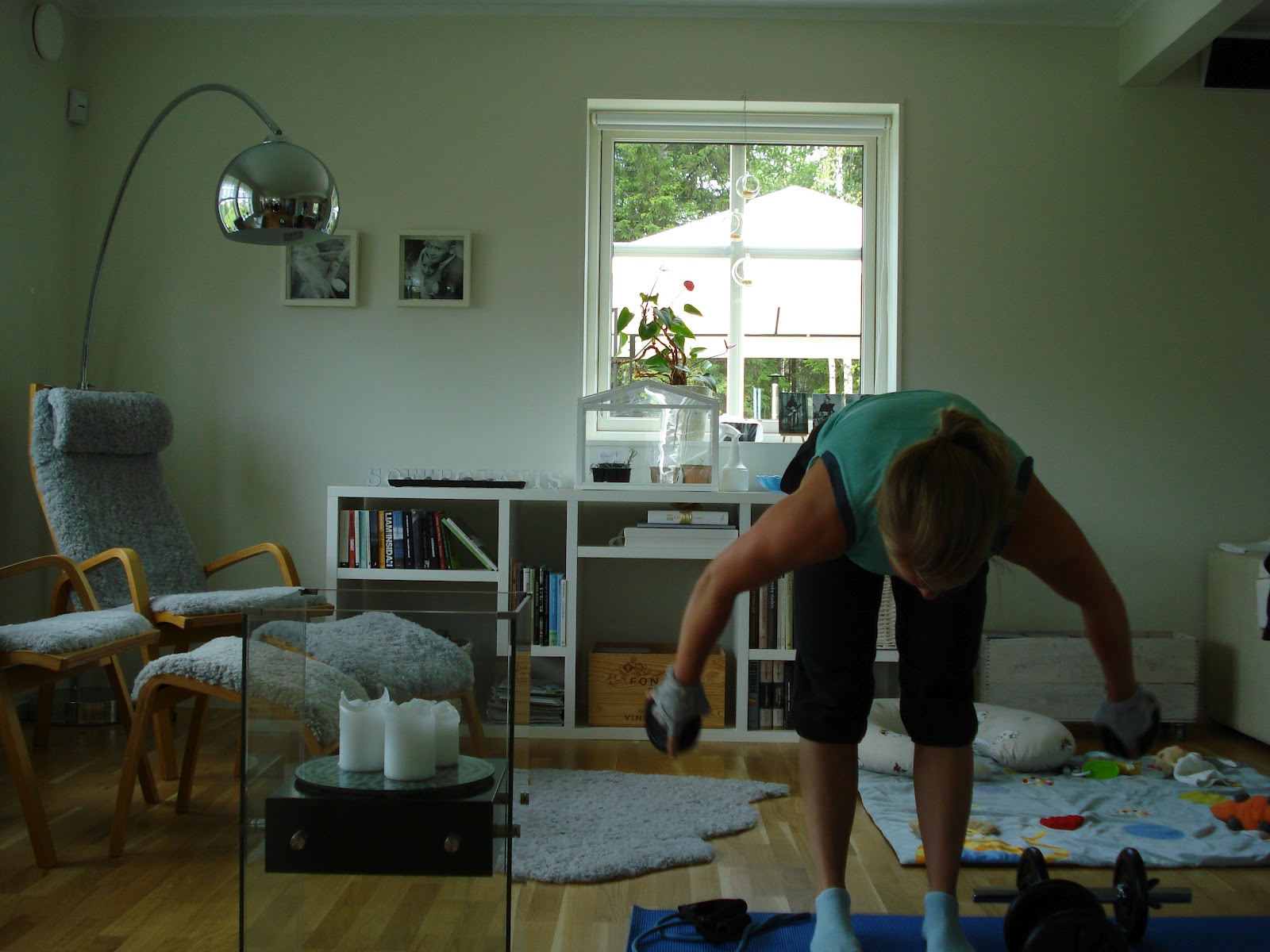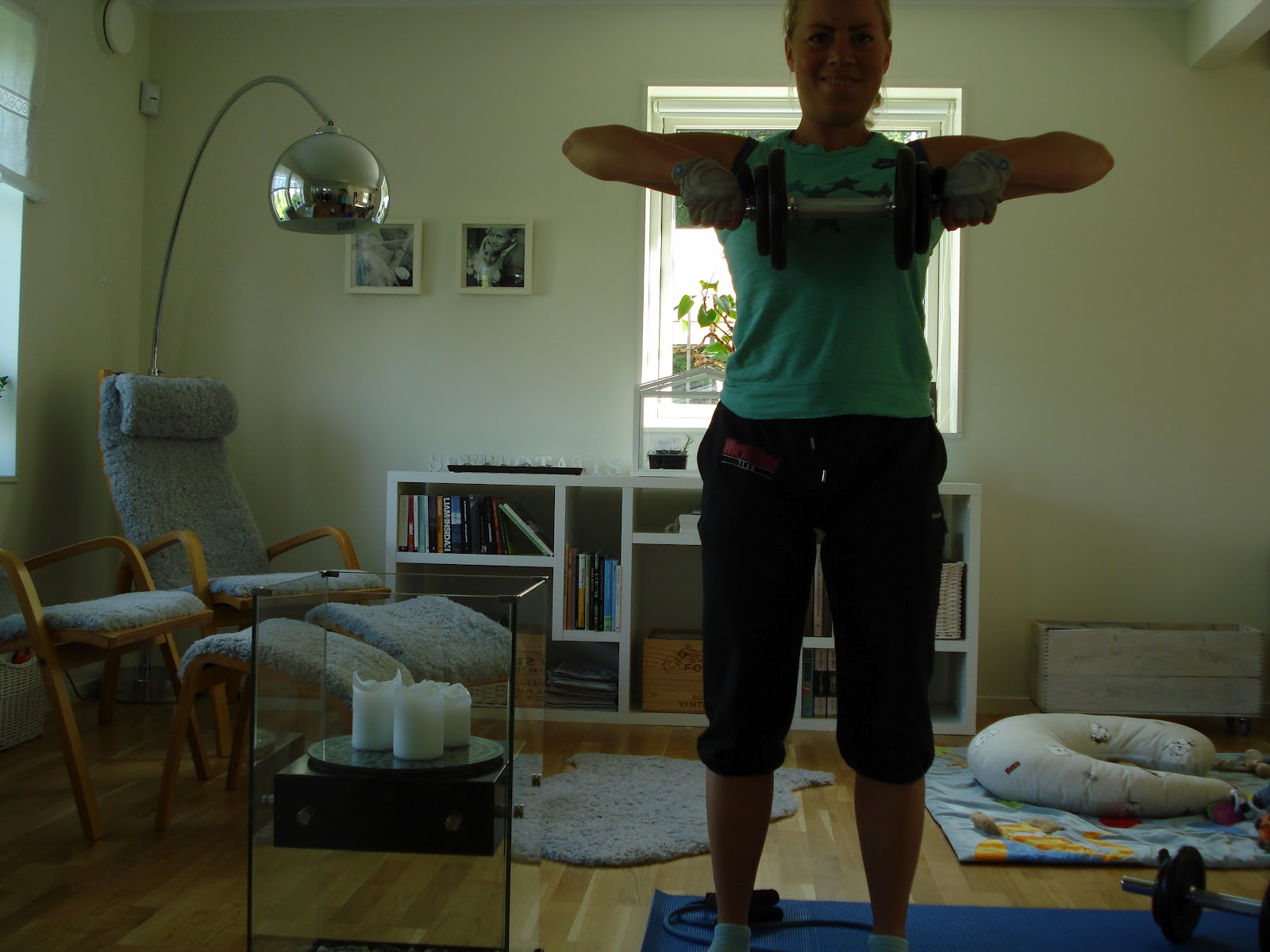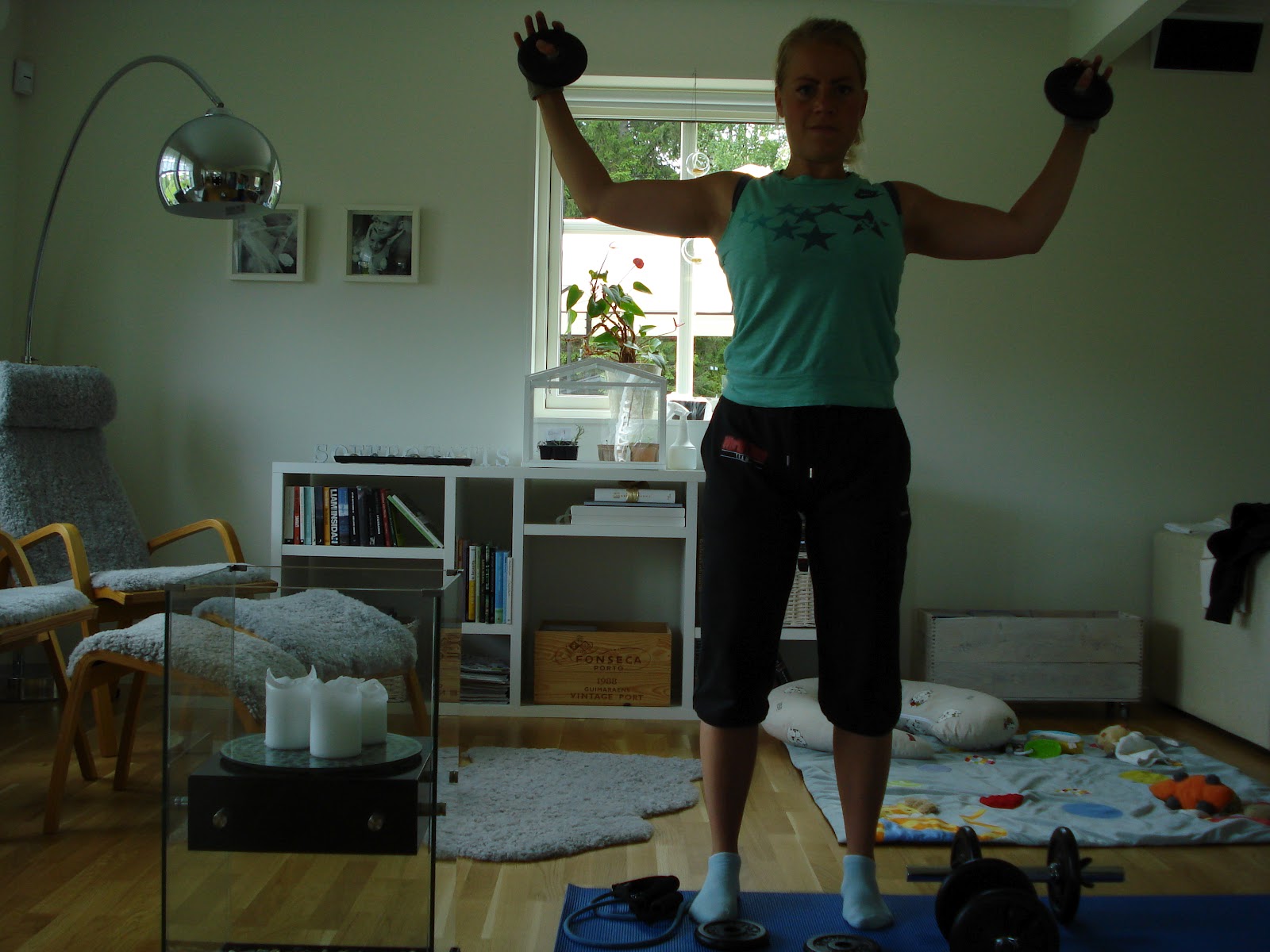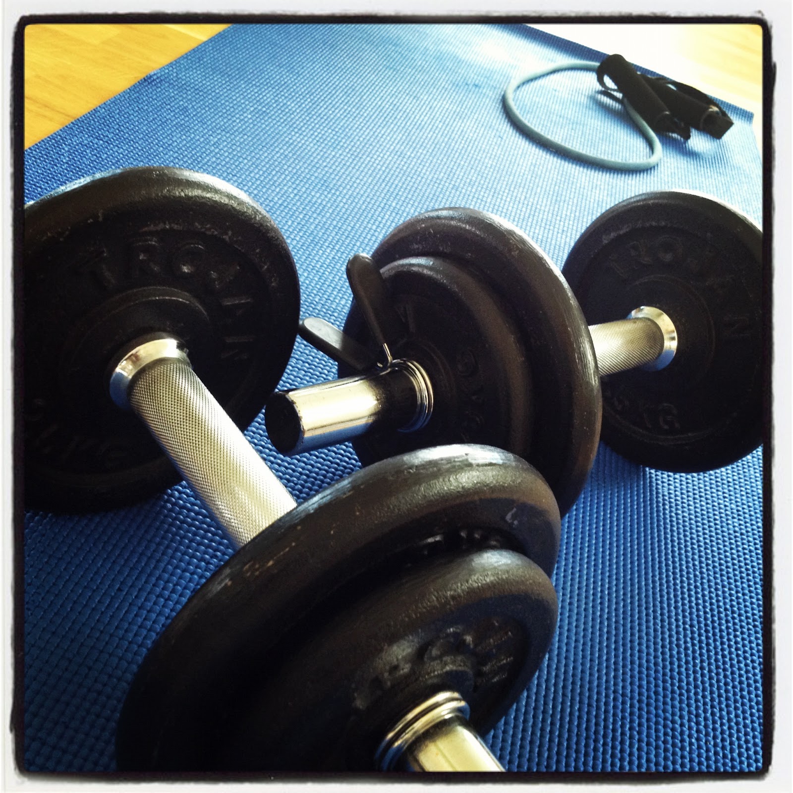 Jag valde att träna endast med hantlarna och viktskivorna idag då jag ville få till så tung styrketräning som är möjligt här i hemmet. Gummibandet använde jag bara till uppvärmningen.