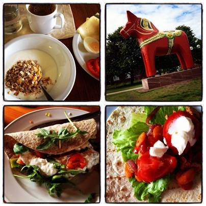 | 1. Frukost på hotellet 2. Ett dagsstopp i Mora 3. God lunch på väg upp till Åre i Toppstugan utanför Svenstavik 4. Liknande lunch, kyckling i fullkornstortilla ”hemma” i Åre |