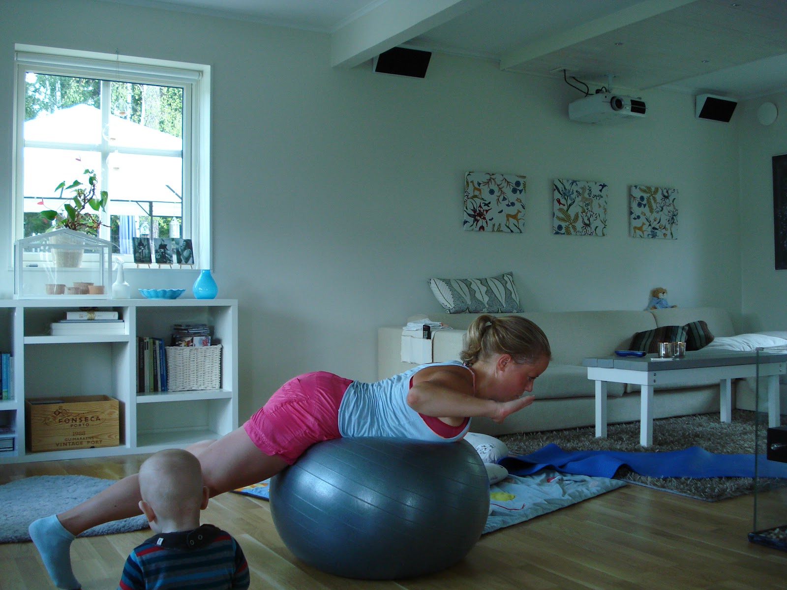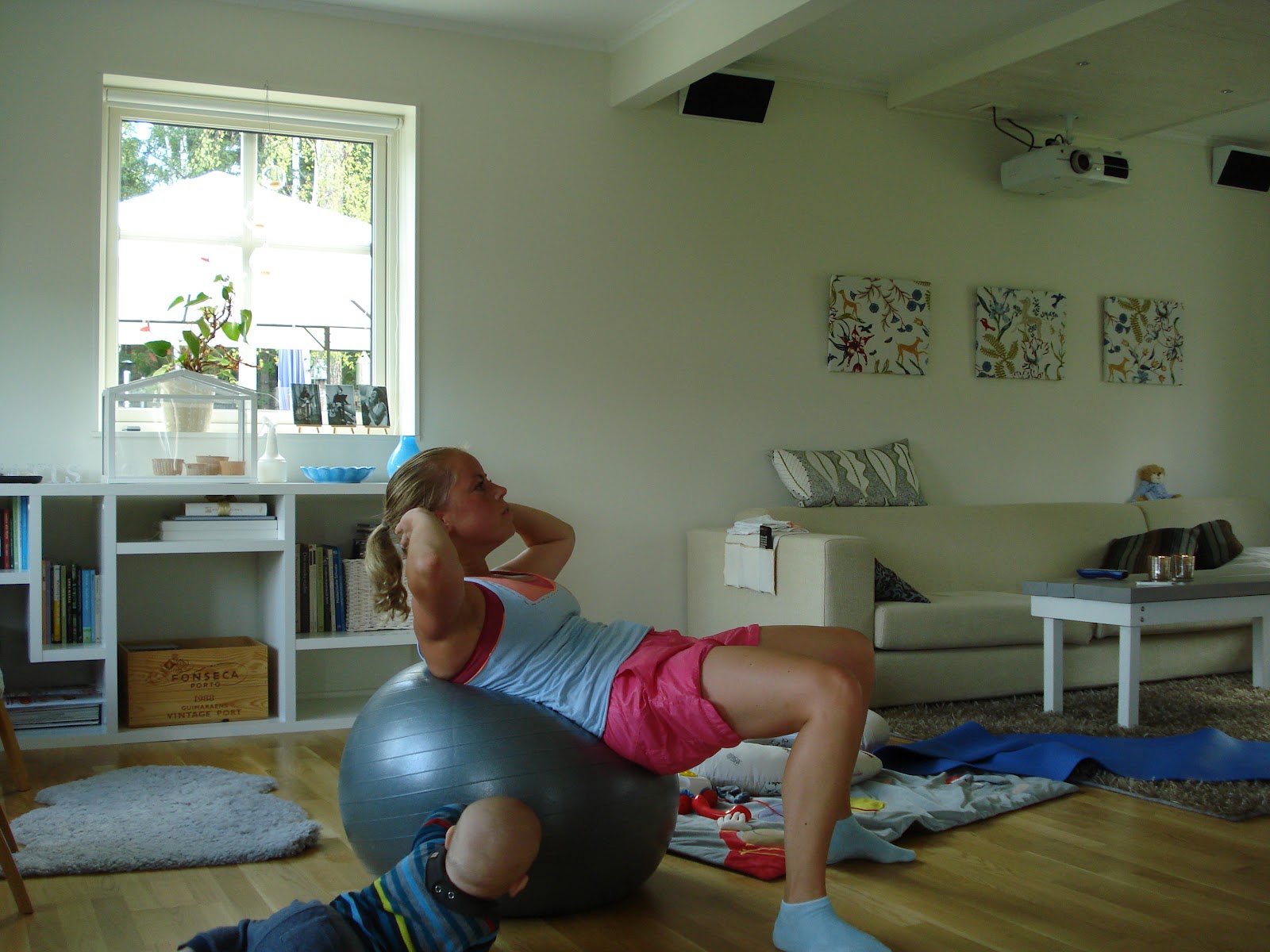 Crunches på boll med nyfiken Wilmer.