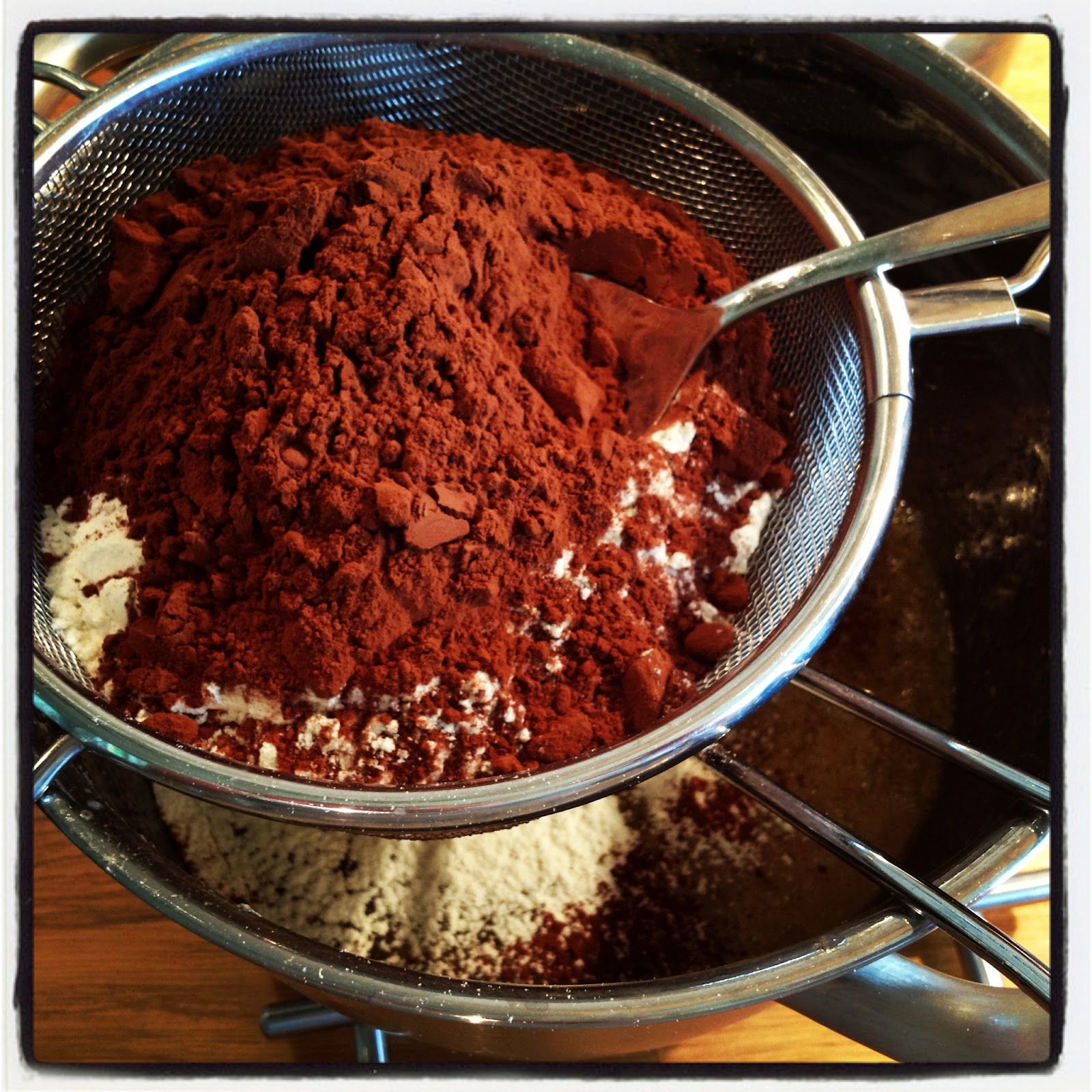 Smält smöret i en kastrull. Ta den från plattan och rör i socker och ett ägg i taget. Blanda mjöl och kakao genom att sikta dem ner i smeten genom en sil. Rör om alltsammans.