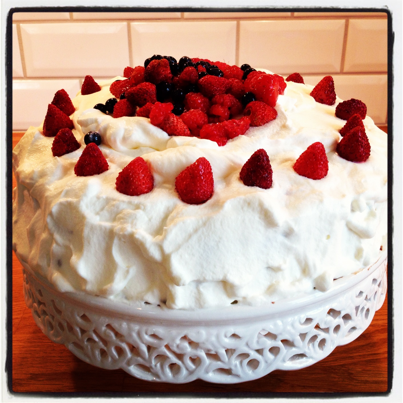 Vispa upp grädden. Mosa hallon eller de bär som du har valt att ha som fyllning. Blanda dem med lite av grädden. Bred blandningen över den ena tårtbottnen och lägg över den andra.