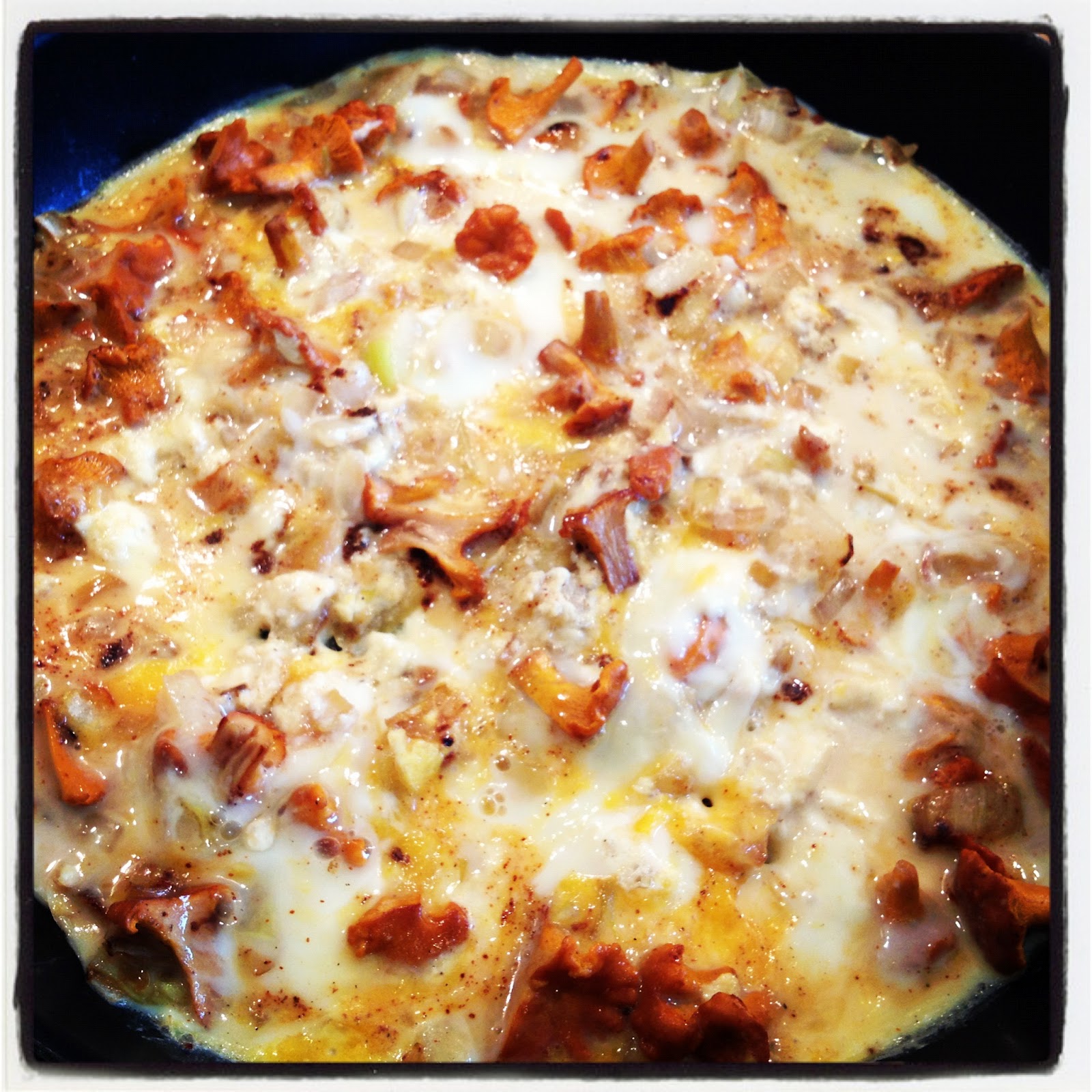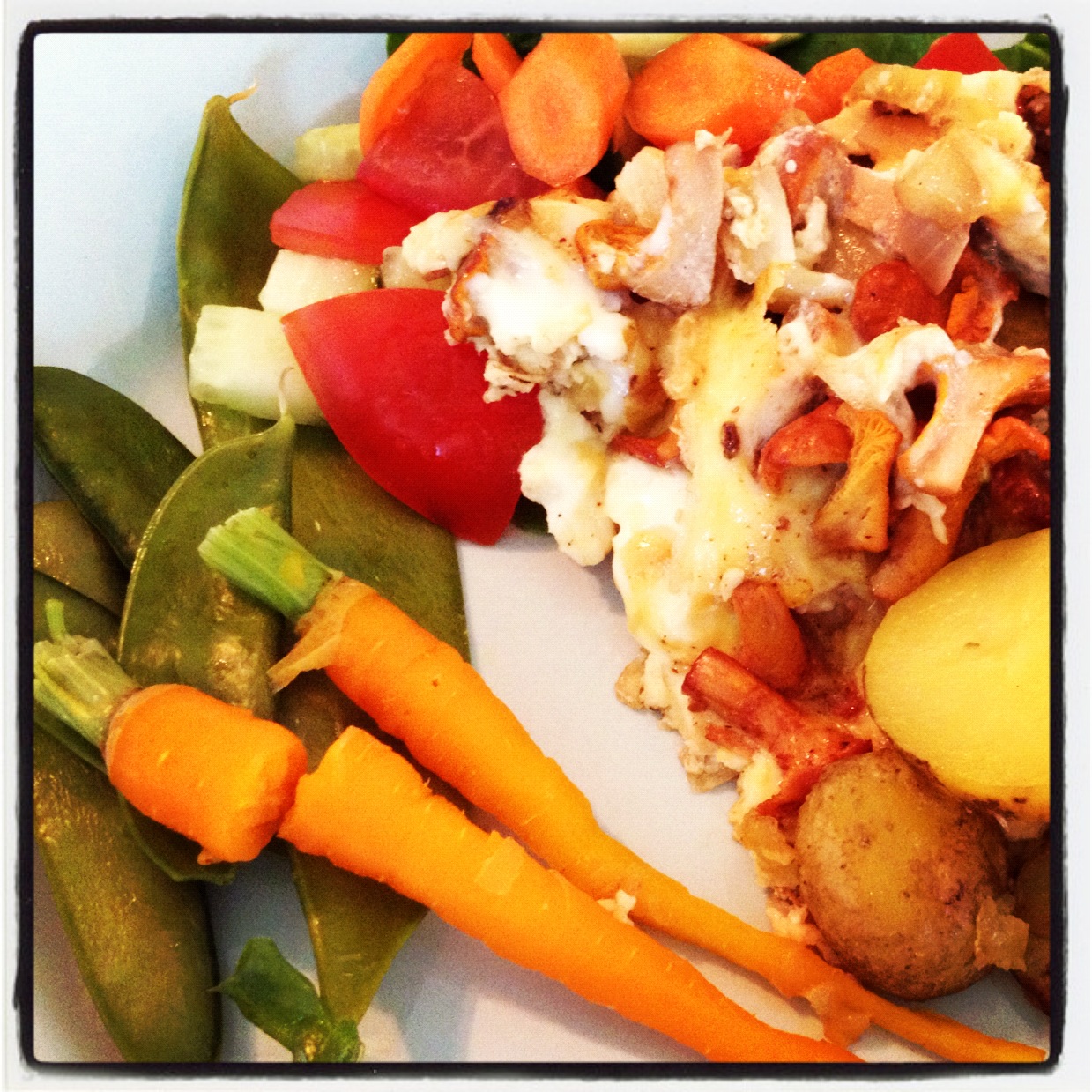 En omelett gjord på lök, ägg, lite mjölk och egenplockade kantareller. Till det grönsaker där sallad, sockerärtor och morötter kommer från odlingslandet.