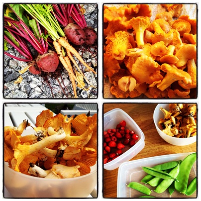I skogen lyser det gult från en hel del kantareller och blåbär finns det fortfarande att ta av. Hallonen kommer fler och fler medan smultron och jordgubbar börjar sjunga på sista versen. Vinbären har också börjat komma nu.