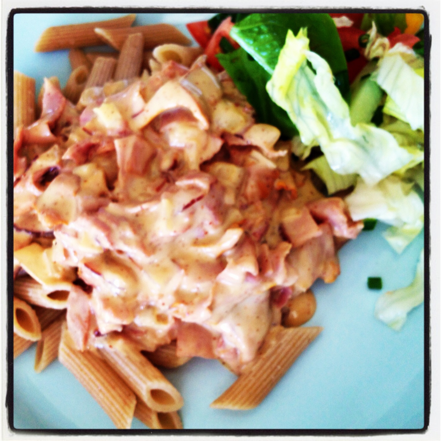 Fullkornspasta med sås gjord på skinka, lök, egenplockade kantareller och creme fraiche med dijonsenap, soja och chili som smaksättning.