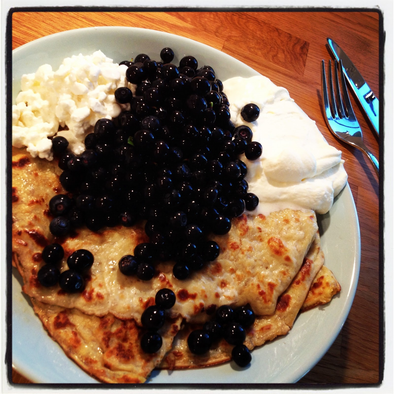 | Blåbär på fiberrik pannkaka med smultron och keso. |