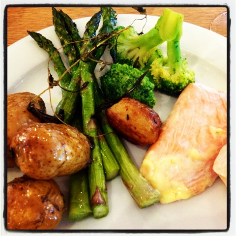 | Min förrätt var den godaste rätten. Mums med lax, ägg och grönsaker. Potatis kändes överflödigt. Istället åt jag en bit knäckebröd med vispat smör till. |