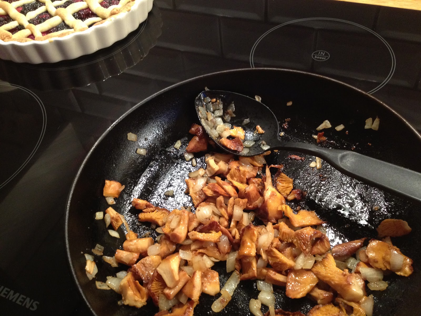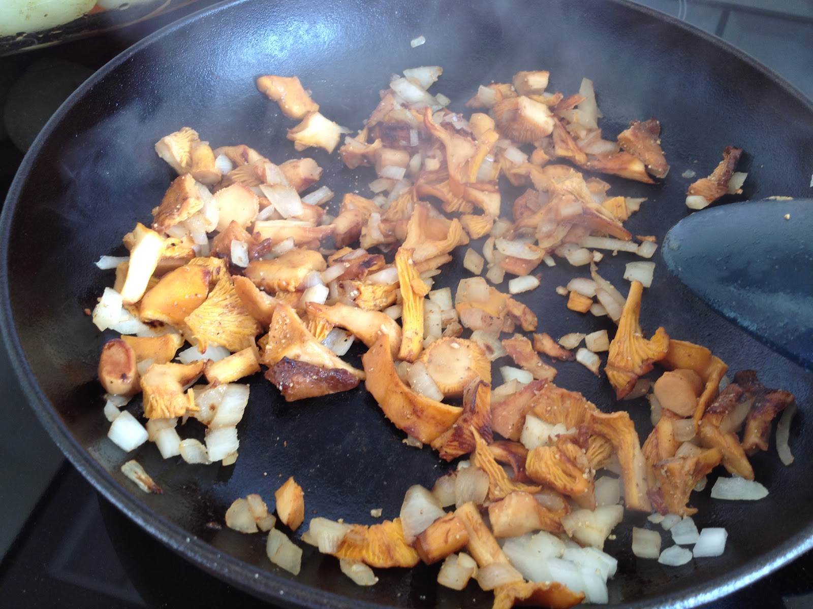 kantarelldag-3 - En kantarelldagBörja med att putsa kantarellerna med en mjuk borste för att få bort all jord. Skär dem sedan i mindre bitar. Hacka löken smått. Fräs kantareller och lök i olivolja i en stekpanna. Krydda med mycket nymald peppar. Jag tycker vitpeppar passar bäst här.