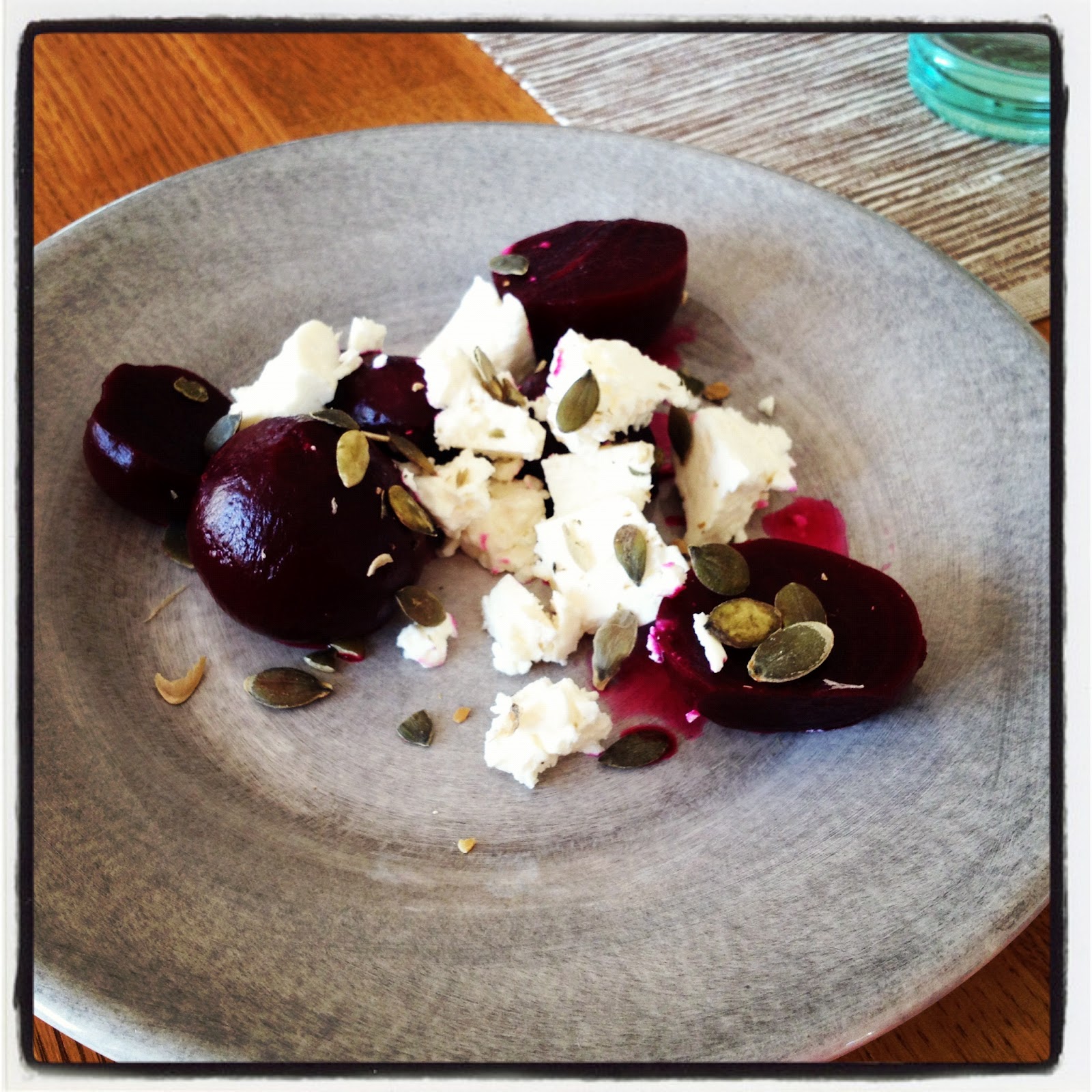 Just kombinationen rödbetor med fetaost och pumpafrön är gott att äta även som tillbehör till en lagad måltid. Igår kväll åt jag det till ugnsomelett och grönsaker. Riktigt smaskigt!