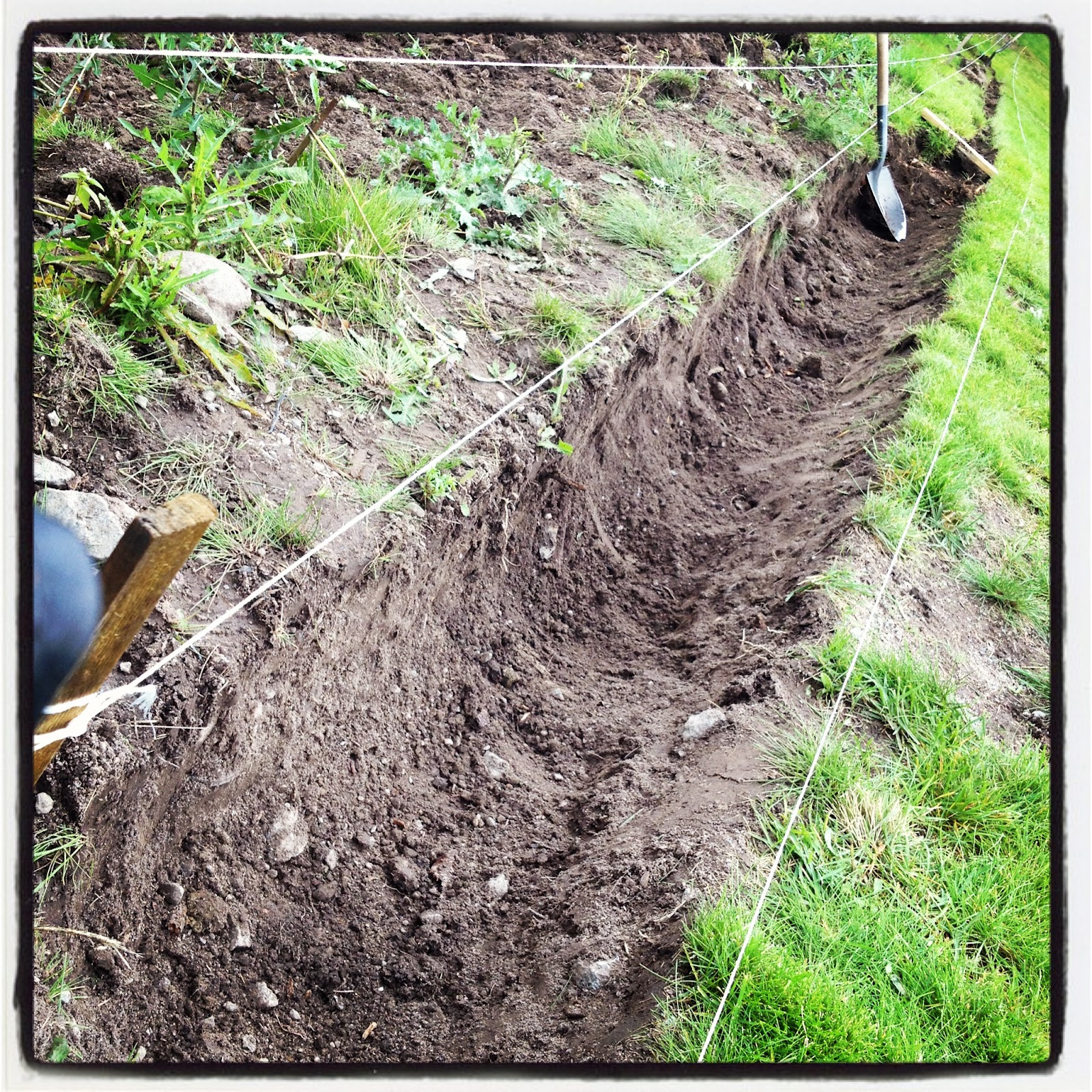 Trots att vi höll på ett bra tag hann vi inte alls gräva mycket av det dike som ska bli 40 meter långt. Jorden just där är full med stenar och rötter så det var inte bara att gräva i lätt jord. Men tids nog ska vi bli klara. Och det är inte förrän i september, oktober någon gång som vi ska plantera häckplantorna.