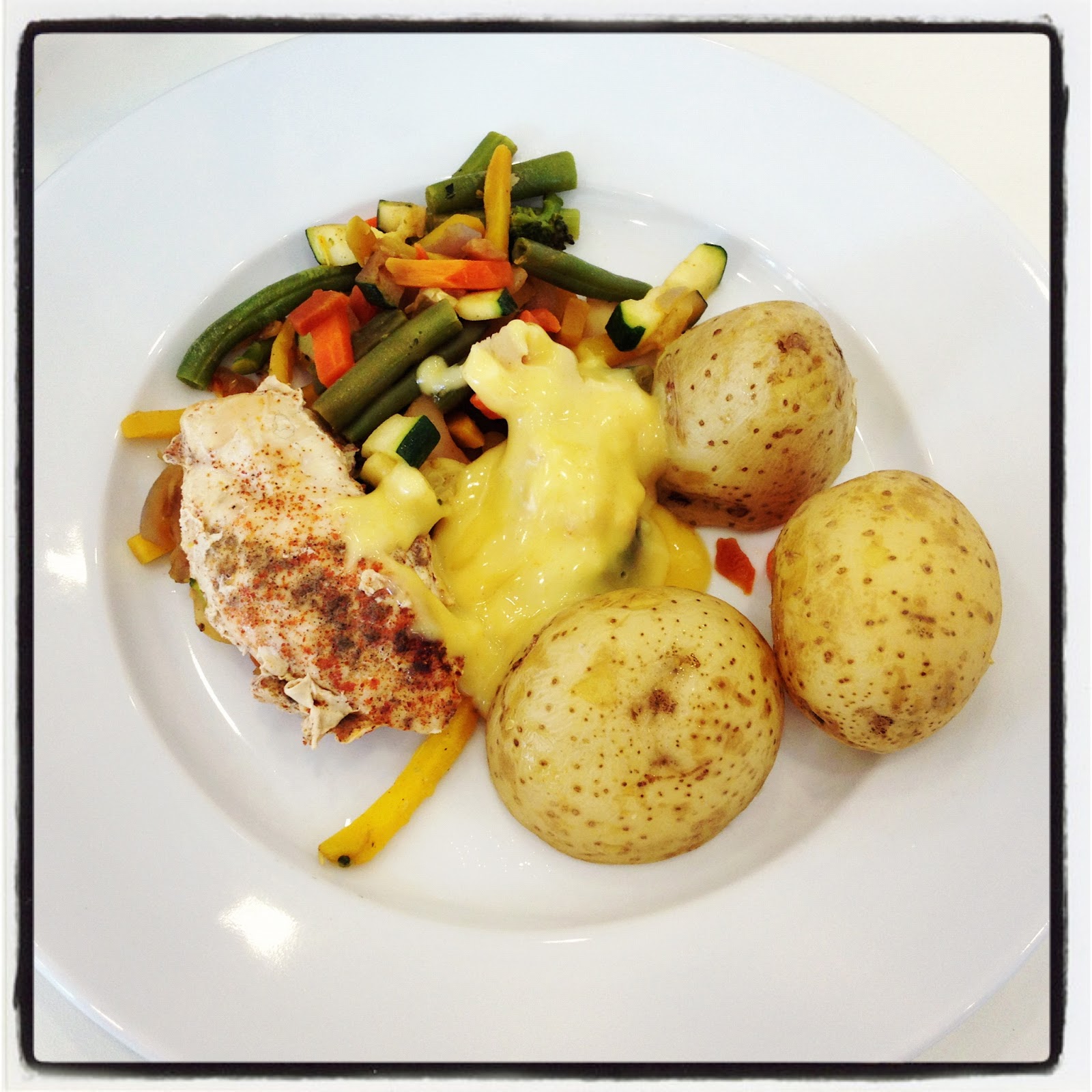 | Dagens lunch: kyckling, wokgrönsaker, zucchini, kokt potatis och aioli. |