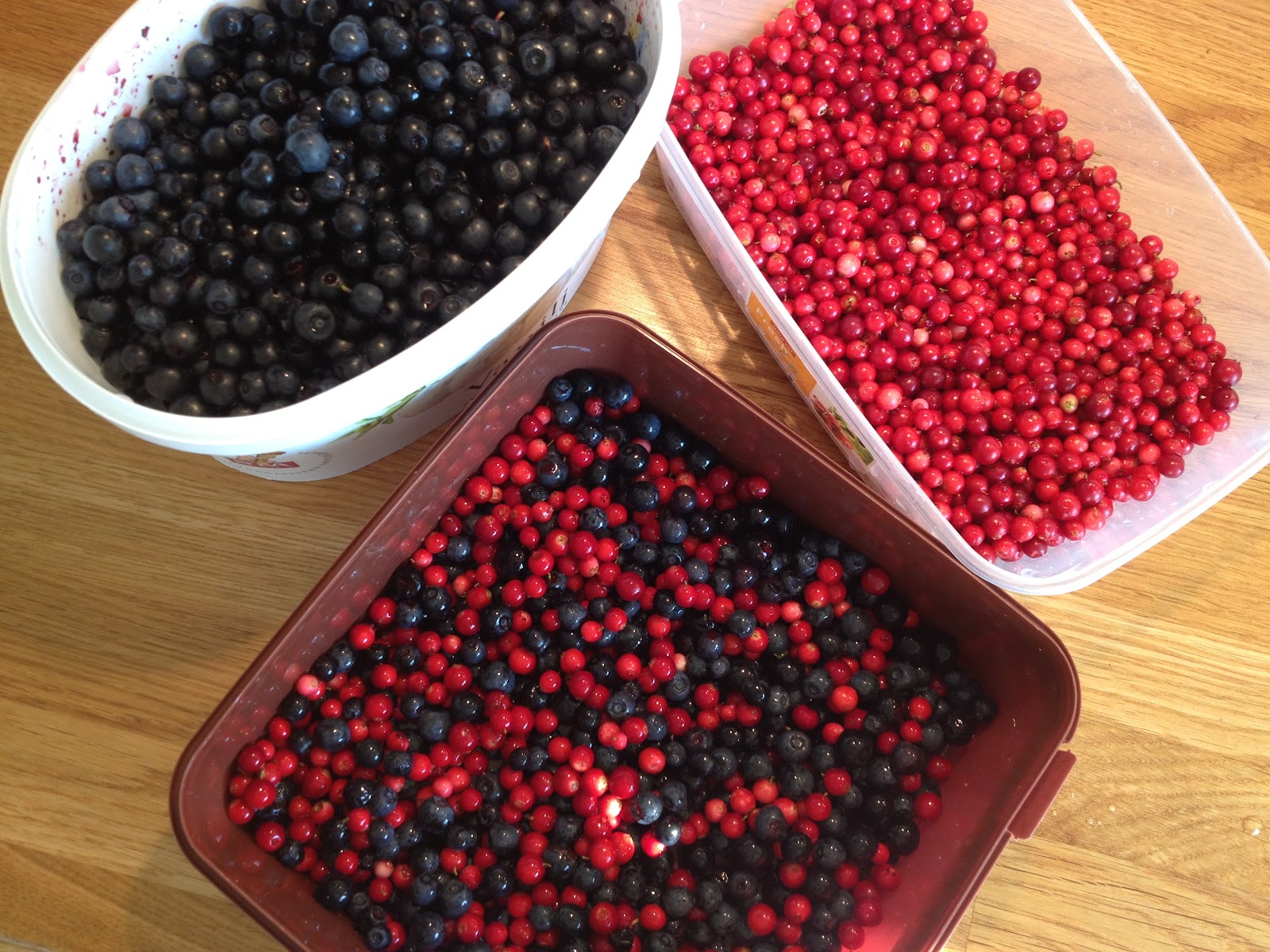 Mycket i rött och blått alltså. För oss var även temat igår rött och blått. Vi spenderade en dryg timme i skogen och plockade där bär i rött och blått. Vi hittade hur mycket blåbär och lingon som helst, som nu ligger i frysen så att vi kan njuta av dem länge framöver!
