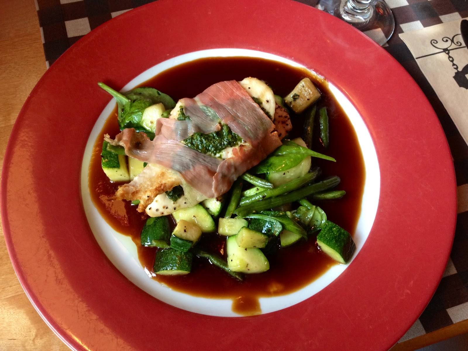 Nu ikväll åt jag middag med en kollega på en restaurang nära hotellet. Min kyckling med pesto, inlindad i skinka och serverad med zuccchini och haricot verts i madeirasås var mycket god!