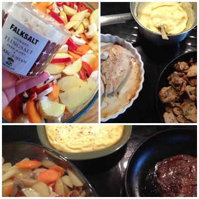 Den här helgen har vi lagat och ätit gott både lördag och söndag. Igår rostade jag potatis, morot, palsternacka, paprika och lök tillsammans med olivolja och nya smaken från Falksalt med Karl-Johans svamp i ugnen. Till det stekte jag entrecote och åt detta med grönsaker och fetaost. Det blev dessutom en del matlagning åt Wilmer.