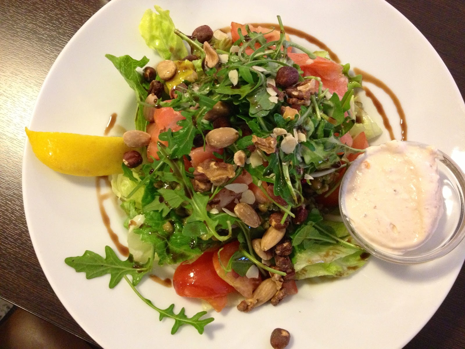 - Lunch: En mycket god sallad från Pong med dinkelmix, rökt lax, mango, granatäpple, sallad, tomat och rostade nötter och mandlar. Åt lunchen tillsammans med två av mina bästa vänner och en bebis. Mysigt!