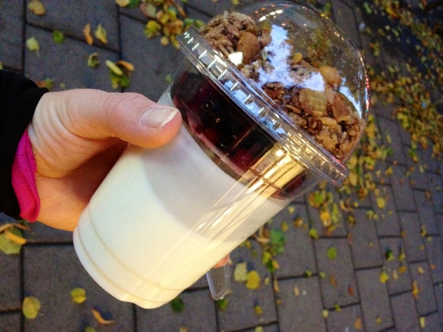 Väljer att ta tunnelbanan den sista biten av morgonens väg till jobbet. Går trots allt lite snabbare och jag känner att jag har sprungit tillräckligt långt nu i alla fall. Fick med mig en god frukost i bägare att njuta av på vägen.