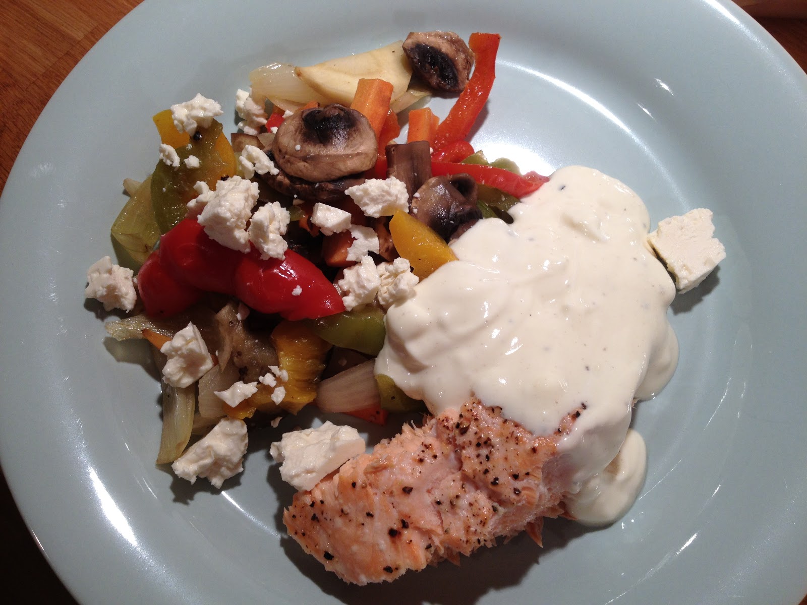 Idag till lunch blev det en portion från både de ugnsrostade grönsakerna och rotfrukterna och potatisen. Med lax och en kall sås gjord på kesella, naturell yoghurt och dijonsenap blev detta en god måltid!