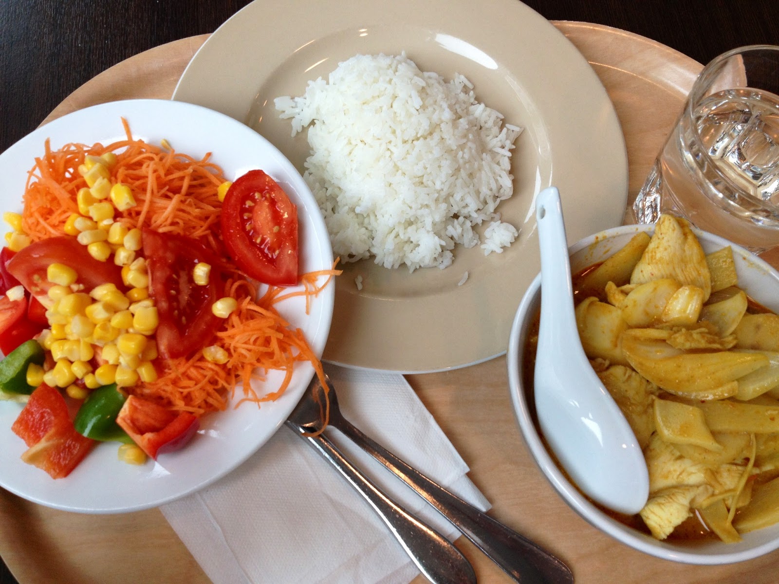 • God och fräsch thaimat smakade bra och gav den energi i form av näring som jag behövde. På restaurangen där vi åt fick man kycklingwoken serverad separat från riset. Bra eftersom jag inte ville ha så mycket ris. Däremot åt jag glatt av kycklingen och grönsakerna i den thaicurrykryddade kokosmjölken. Det fanns även en stor salladsbuffé att plocka grönsaker från. Resultatet: en näringsriktig och nyttig måltid.