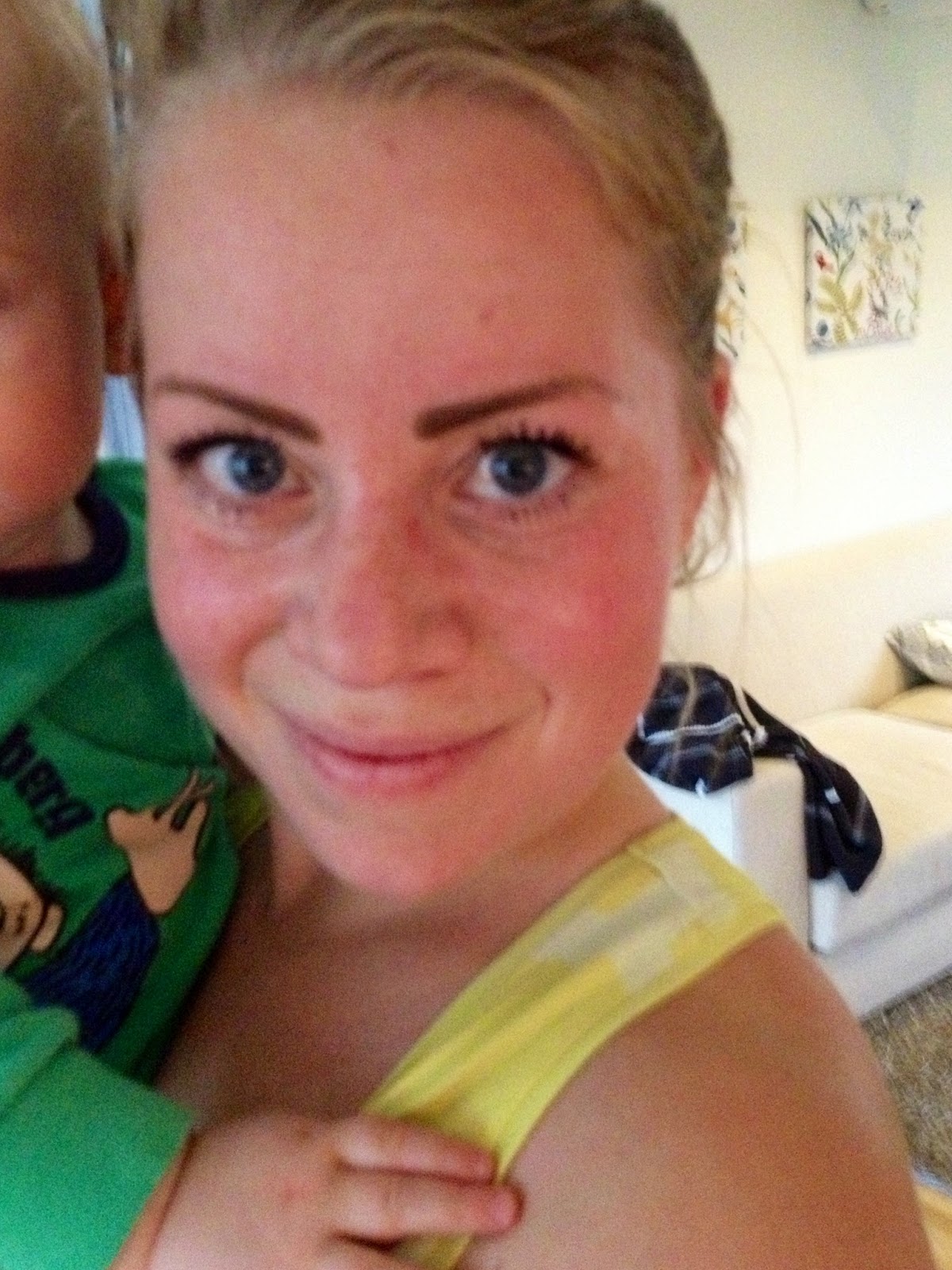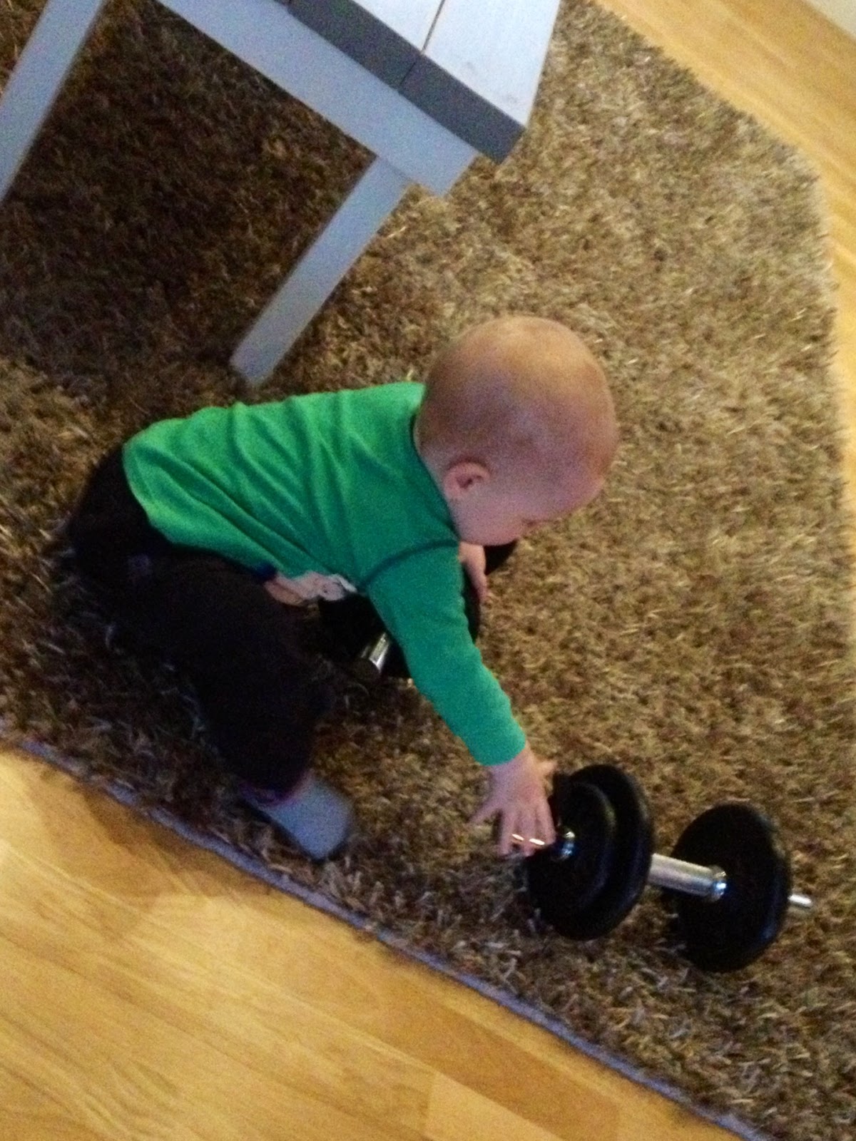 Wilmer är inne i en period när han vill komma upp i famnen väldigt ofta och speciellt när han ser mamma hoppa. Så han fick agera min vikt i flera av övningarna. I några av de andra övningarna kollade han på i stället. Och när jag sprang med höga knän runt bordet sprang han efter. Trots att han inte fyllt ett år ännu så springer han väldigt bra!
