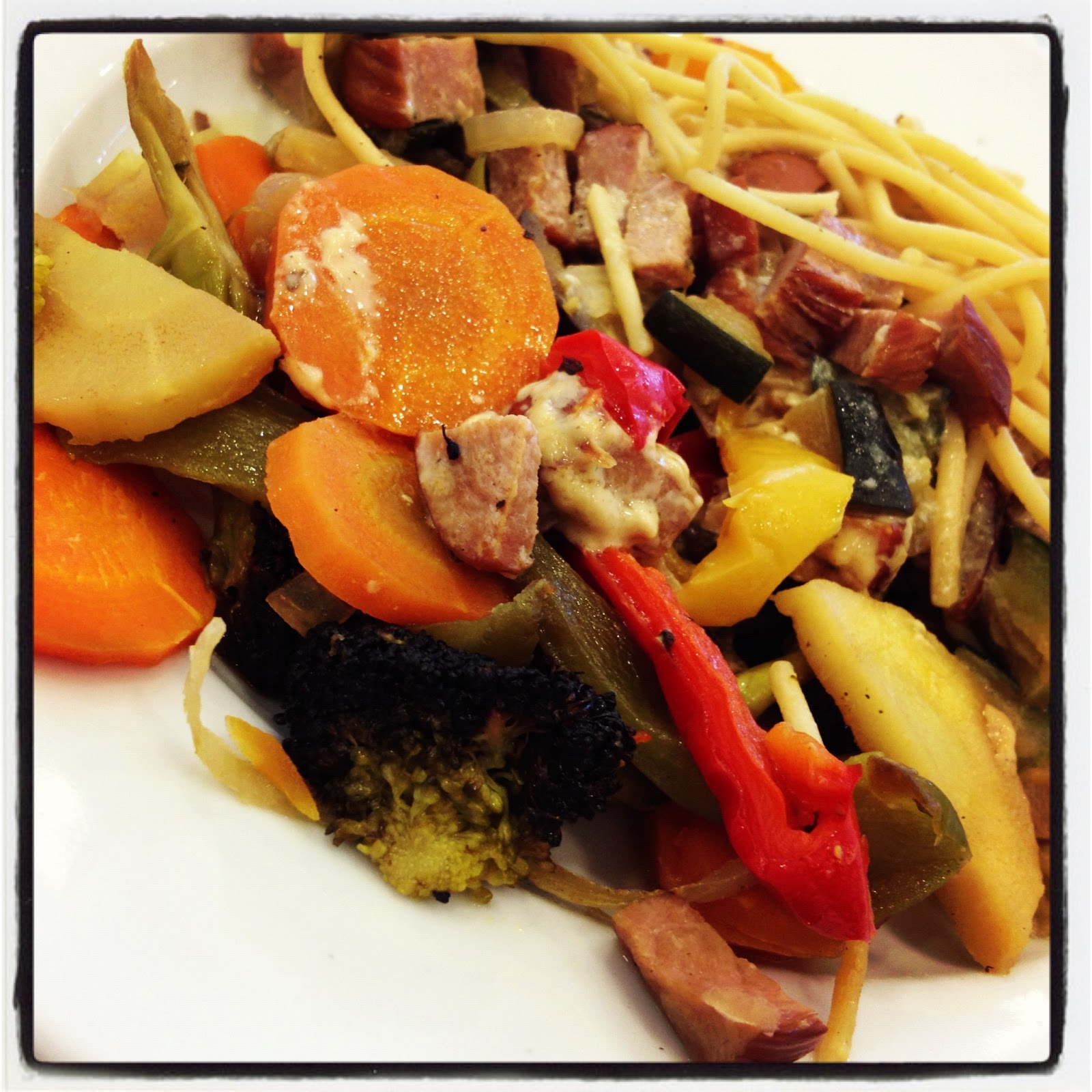 Vad blev det för mat till då? Igår kväll valde jag en burk tonfisk tillsammans med de ugnsrostade grönsakerna ackompanjerat tomat och fetaost. Idag till lunch åt jag dem med spagetti och skinksås. Och ikväll vankas detvomelett istället tillsammans med allt det färgglada.