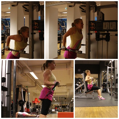 - Triset: drag bak mot bröst i kabelmaskin, sittande + hantelflies + drag upp mot bröst i kabelmaskin