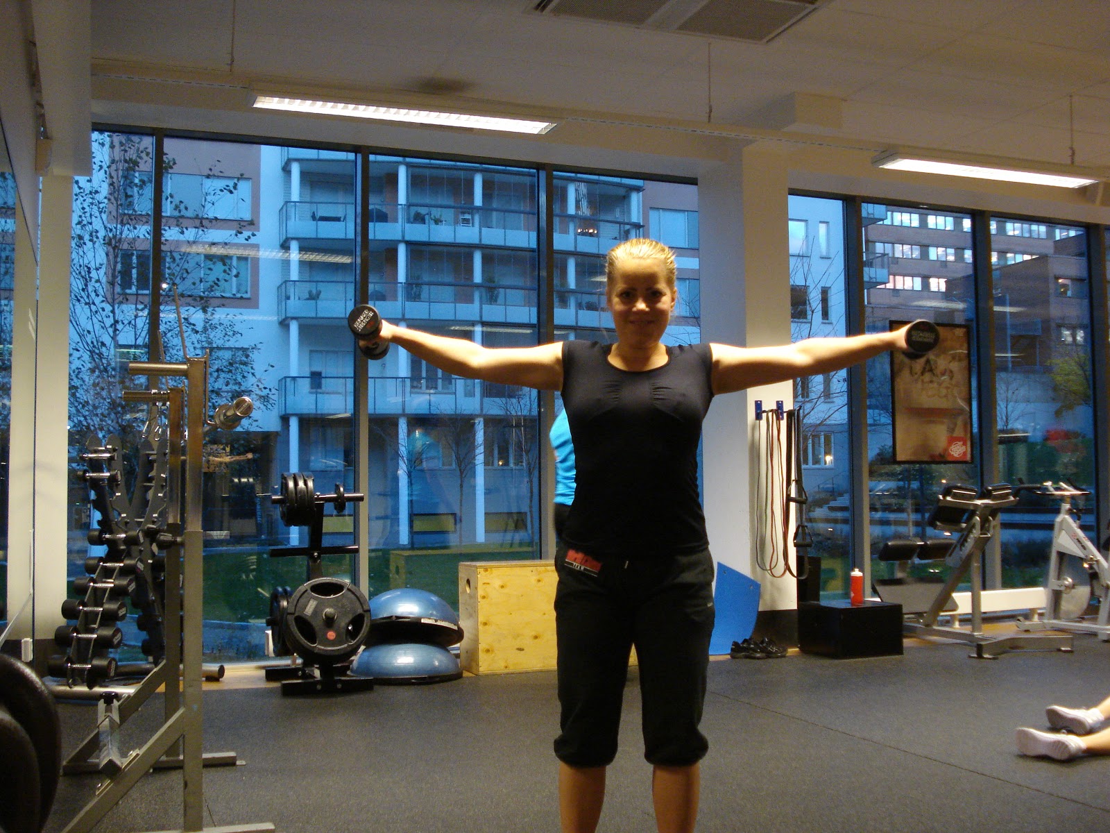 - Triset: hantellyft framåt/uppåt + hantellyft utåt sidorna + armrotation för rotatorkuffen med hantlar