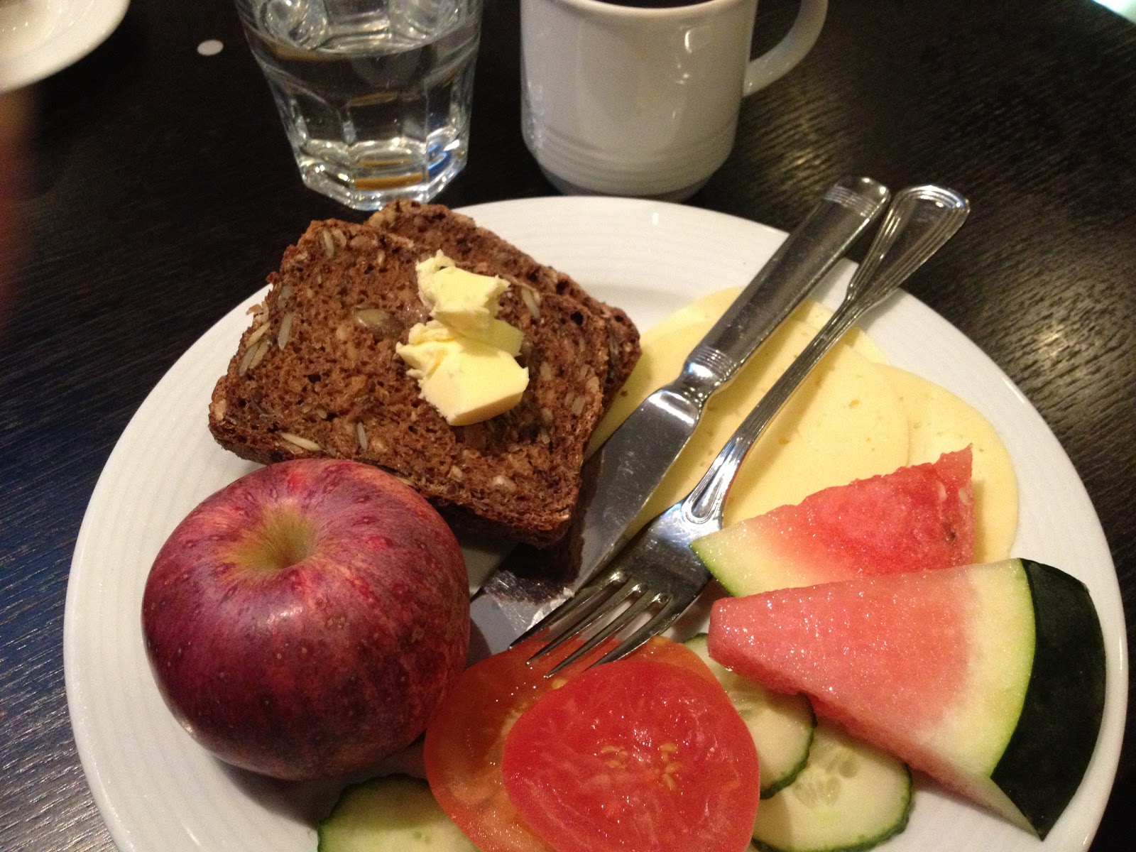 | Min frukost: gott, grovt, finskt bröd med hela korn, smör, ost, ett kokt ägg, frukt, grönsaker, kaffe och vatten. |