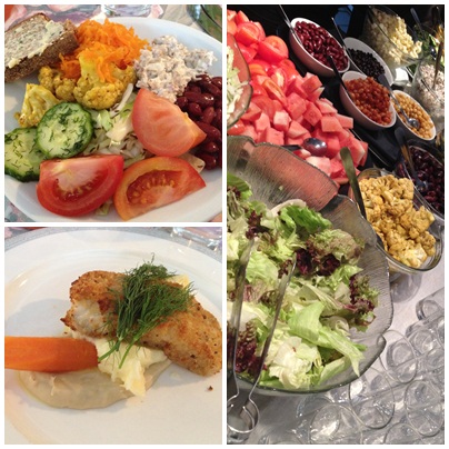 | Min lunch: sej med potatismos och grönsaker från en stor salladsbuffé med mycket gott att välja på. |