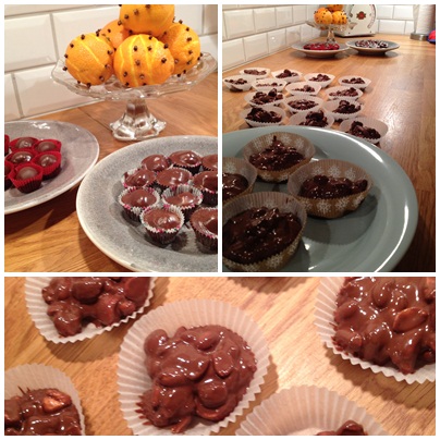 Bilderna visar det julgodis jag gjorde igår kväll. Tre sorter blev det och alla goda, kan jag intyga: mozartkulor, nougatkulor och rocky roads. Annars brukar jag göra fler godissorter än så på julen, men i år har inte det rikitgt hunnits med.