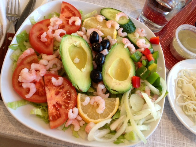 Äntligen har vi fått njuta av solen idag! Vi gjorde det genom en promenad vid sjön och i ett villaområde intill. Efter det smakade det gott med en avokado- och räksallad på en pizzeria. Jag väljer alltid just den salladssorten när vi äter ute på pizzahak. Och den här gången var avokadon helt perfekt!