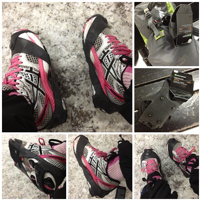 När jag sprang till gymmet i morse hade jag halkskydd på löparskorna. Har känt de senaste dagarna att behovet för det har varit stort med all snö och is som finns på vägarna nu. Trots att jag brukar springa och gå mycket även på vintrarna har jag inte testat det tidigare.