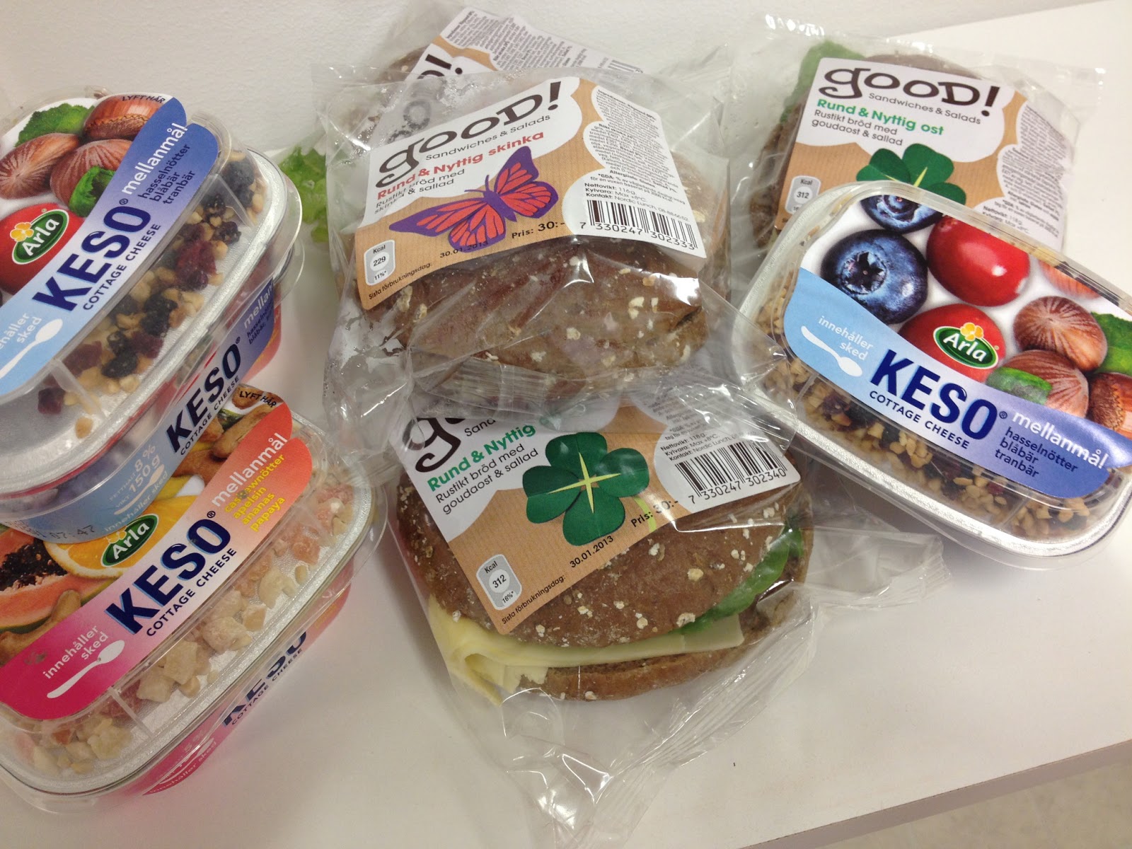 - Frukost: en mellanmålskeso (keso, torkade bär och hasselnötter) och en halv fullkornsfralla med skinka och sallad