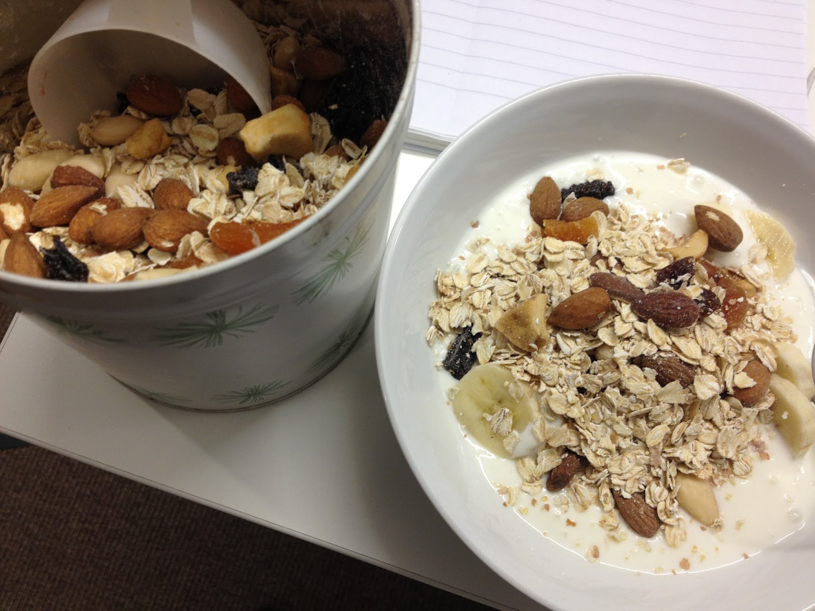 Just nu sitter jag på jobbet och längtar till min lunchträning. Brukar ju nästan alltid träna på morgonen annars de dagar jag tränar. Men idag tänkte jag alltså testa att träna på lunchen istället. Fick dock en liten dos motion och frisk luft nu på morgonen när jag cyklade till tåget och gick genom stan till kontoret. En lagom dos för att kicka igång mig och bli sugen på frukosten som jag nu äter. För tillfället har jag havregryn blandat med torkad frukt, nötter och mandlar i en burk på jobbet. Till det äter jag en frukt och naturell yoghurt. Gott och mättande!