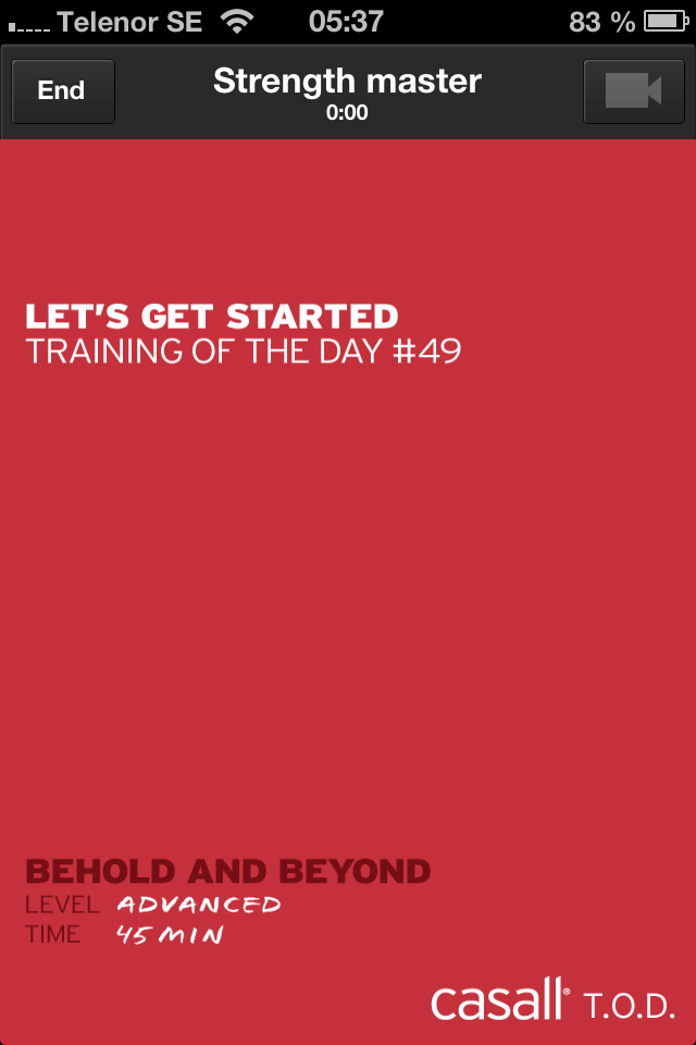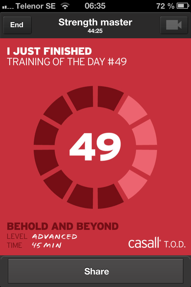 Min morgonträning idag bestod av ett pass från Casall’s Training of the Day app. Hade egentligen tänkt att lägga störst fokus på benträning idag, men nu blev det lite mer blandat än så med träning för överkropp, ben och rumpa samt puls. Jag valde att modifiera passet Strenght Master, som jag körde, något. Dels för att jag inte hade alla redskap som man behövde för passet och dels för att anpassa det efter vad jag behövde träna idag.