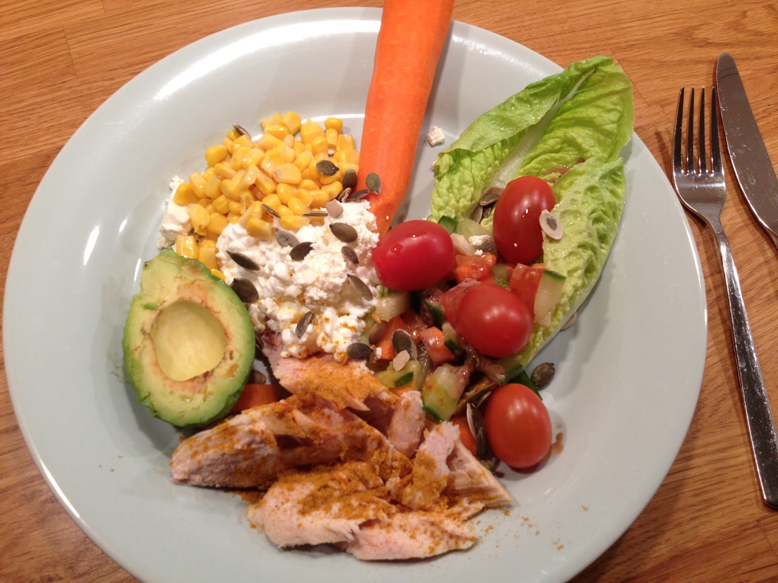 Middagen igår: kyckling med curry, grönsaker i en sallad, en morot, keso, fetaost, avokado, majs, körsbärstomater och pumpafrön.