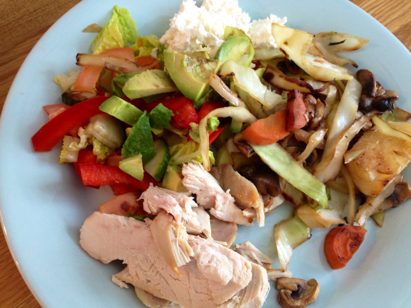 Lunchen idag: kyckling med stekt vitkål, morot och champinjoner, sallad av tomat, gurka, romansallad och paprika, fetaost och avokado.