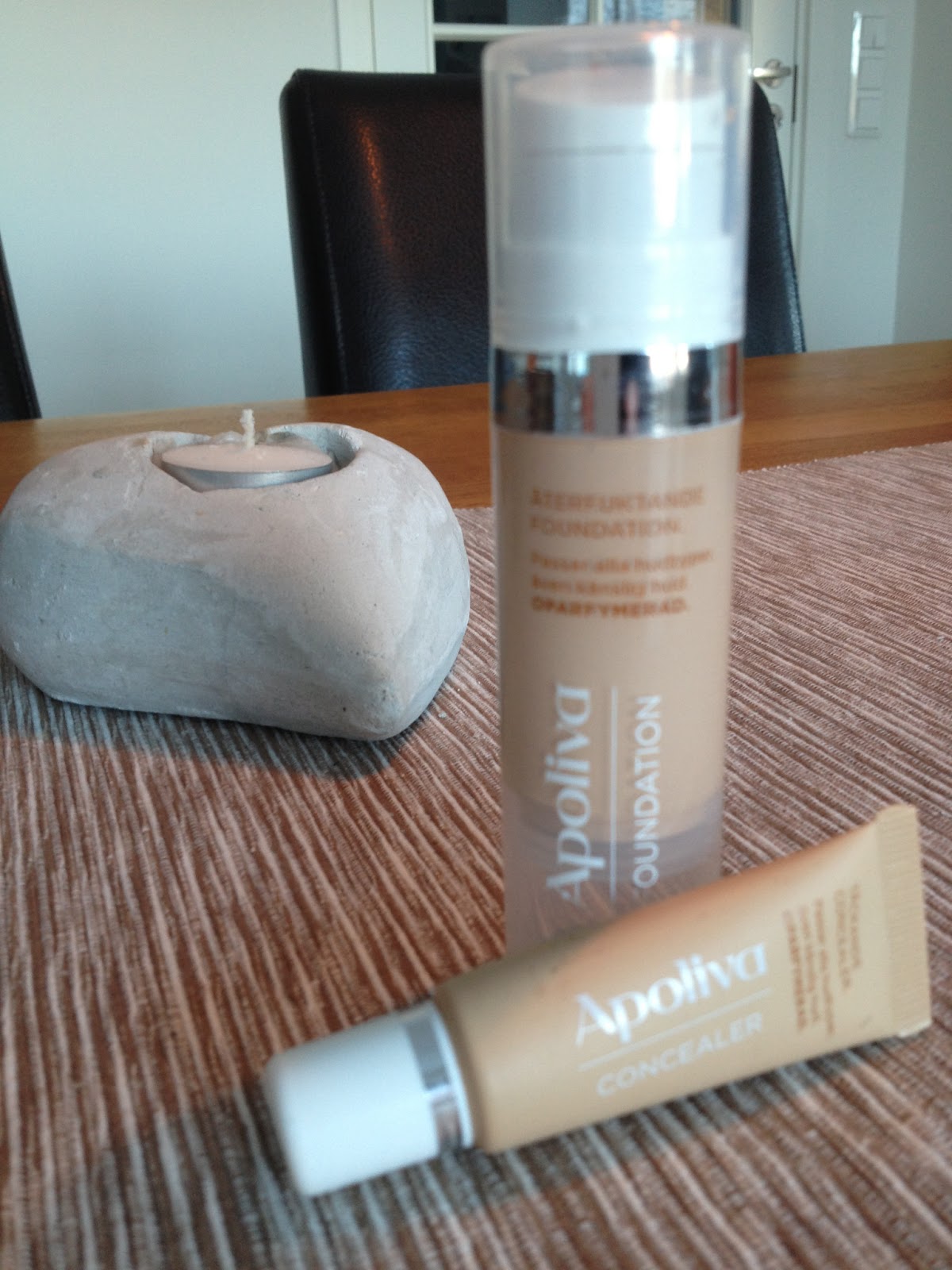- I serien APOLIVA ingår även en rad sminkprodukter, som alla är utvecklade för en känslig hy och är parfymfria och där deras foundation är en favorit hos mig. Apoliva foundation finns i tre naturliga färger. Den är återfuktande, döljer ojämnheter och skapar en naturlig jämn bas för din makeup. Jag gillar den främst för att den täcker min glåmiga hud så bra!