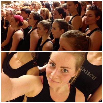 Obligatorisk gruppfotografering, alla i svarta linnen från Röhnisch. Vi var 130 träningssugna och glada tjejer och killar på plats. Härlig stämning!