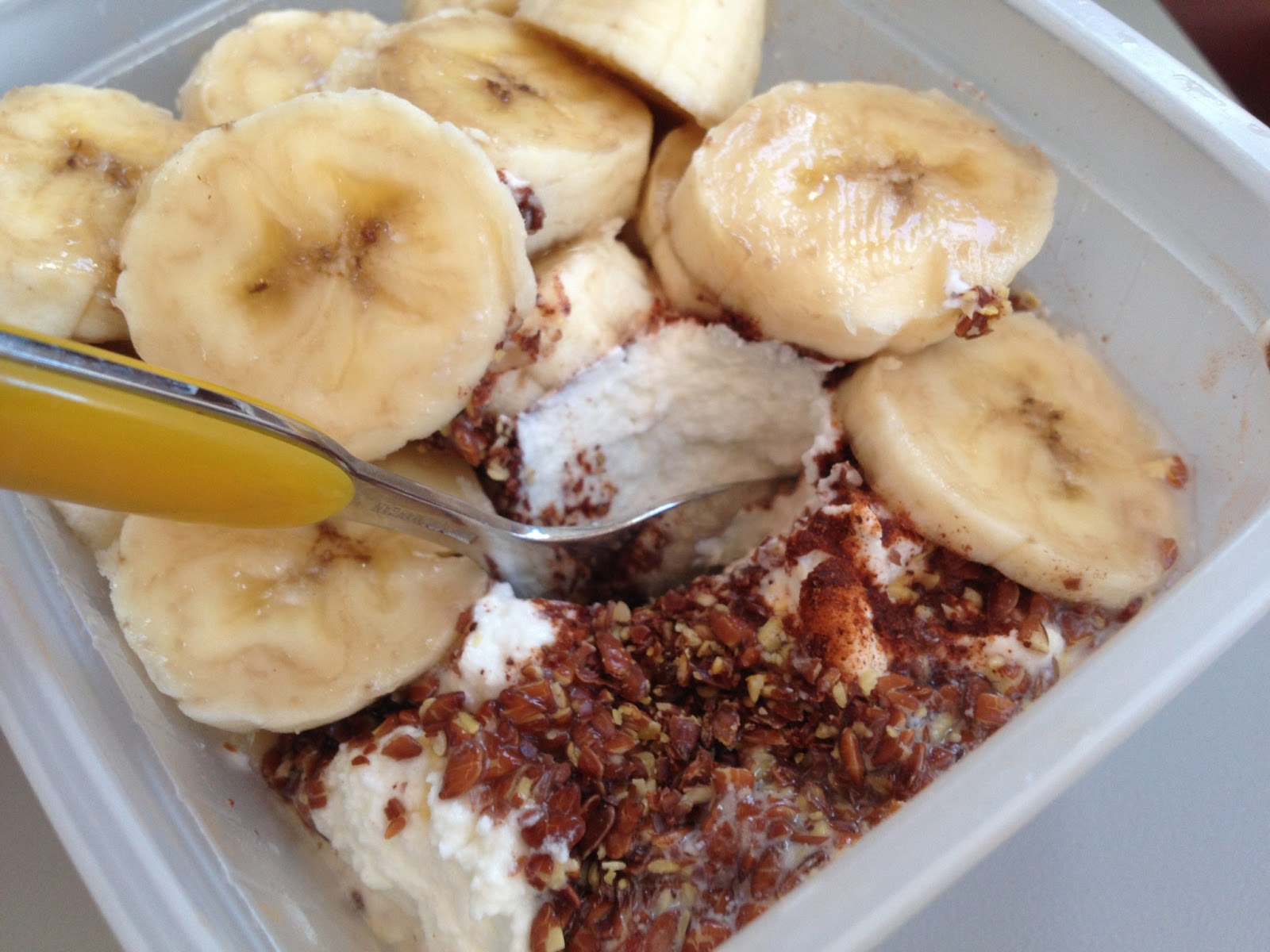 I morse åt jag min frukost på flyget bestående av banan, keso, kvarg, krossade linfrön och kanel.
