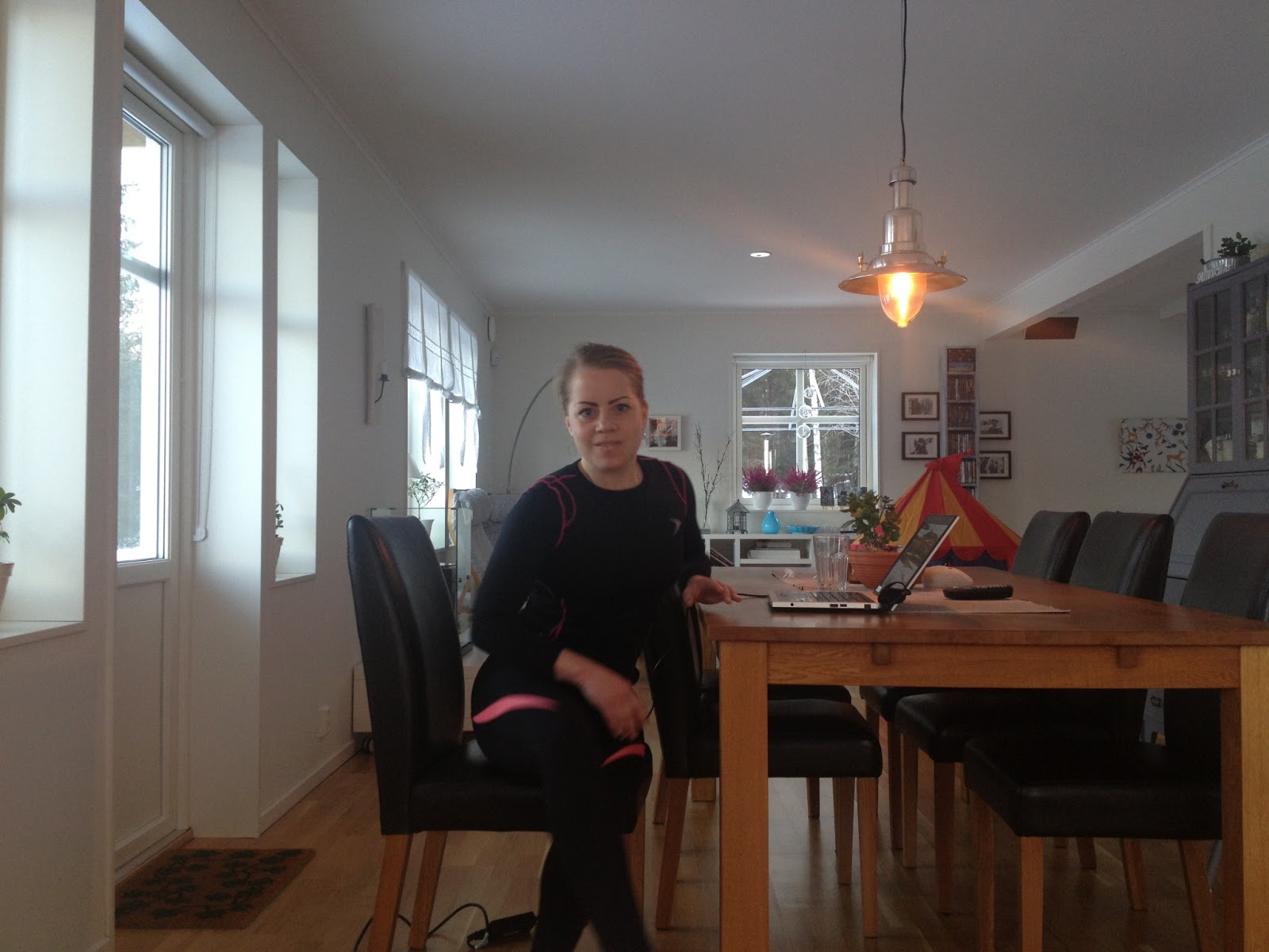 Bild: Jag i morse jobbar vid köksbordet med löparoutfiten på. Effektiv arbetstid innan barnet vaknar!