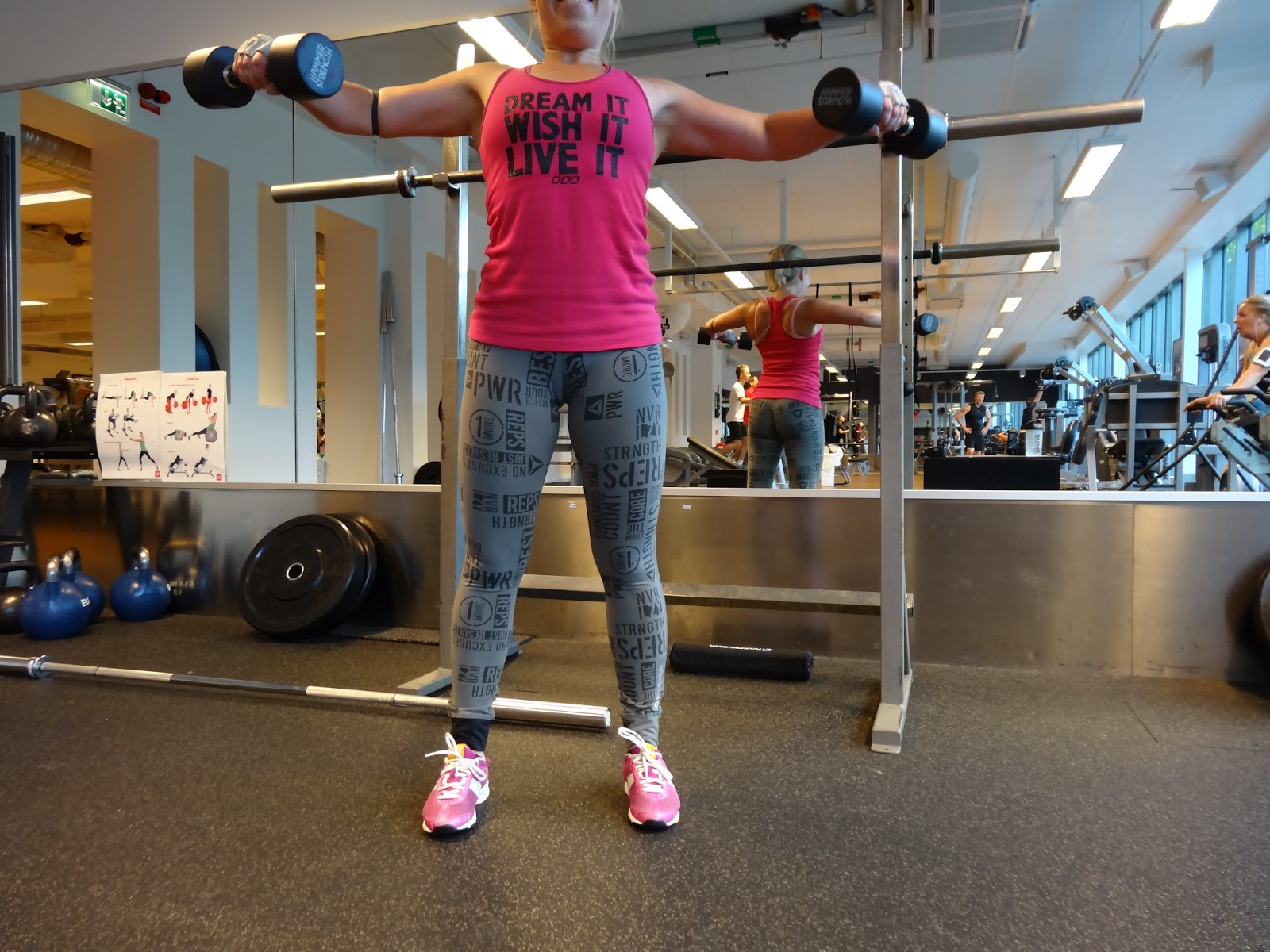 - Triset: hantelflyes + hantelpress uppåt/framåt med raka armar + hantelpress ovan huvud