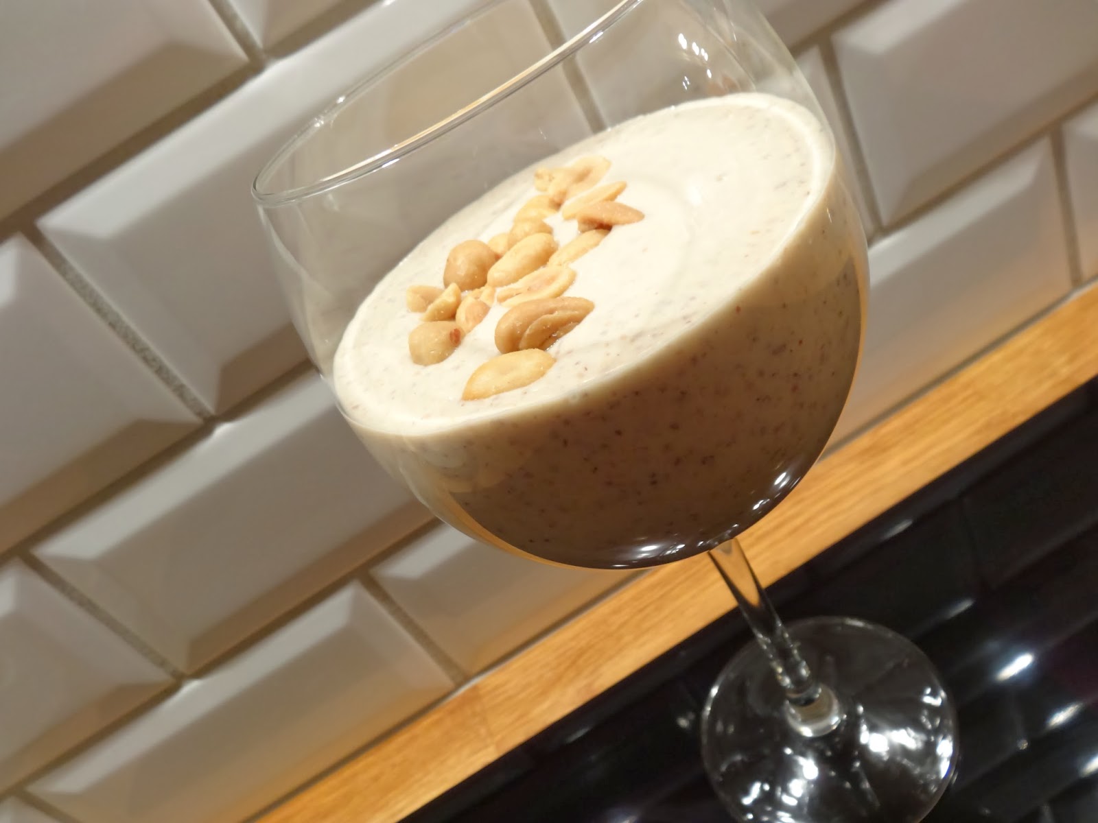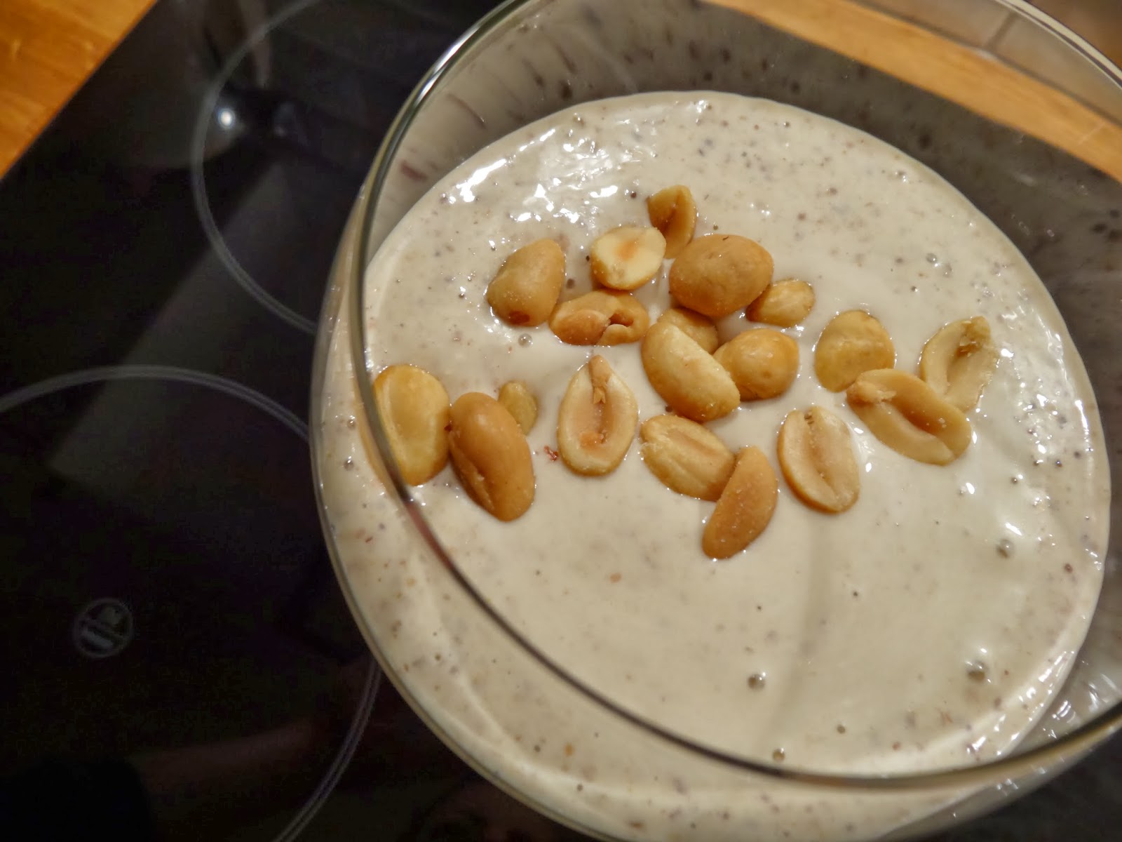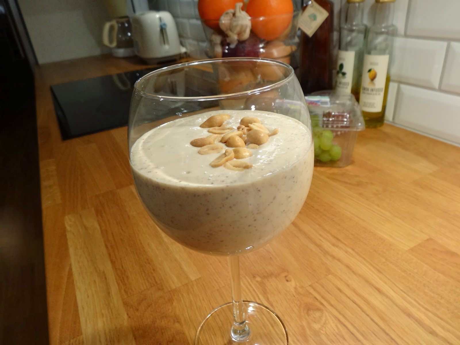 Blanda ihop allt i en mixer. Jag spädde ut med mjölken till sist för att få en bra konsistens och inte en för trögflytande smoothie. Toppa med jordnötter.