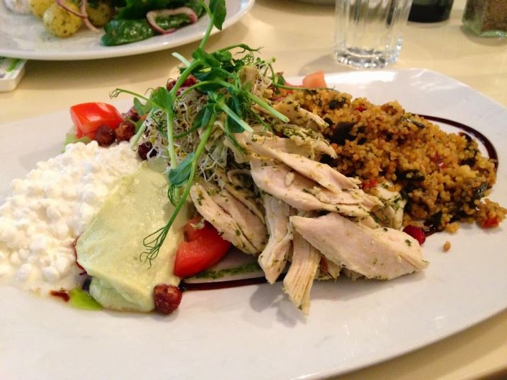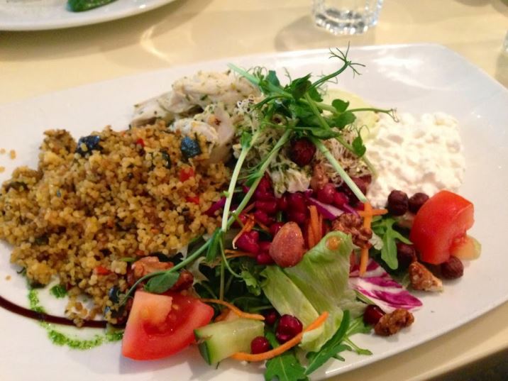Min tallrik bestod av kyckling, bulgur stekt med grönsaker, en mängd härliga färska grönsaker som tomat, gurka, sallad och groddar av olika slag, toppade med granatäpplekärnor och rostade nötter. Till det keso och guacamole. Helt underbart fräscht och gott! Det här med rostade nötter och kärnor från granatäpple måste jag börja med hemma också.