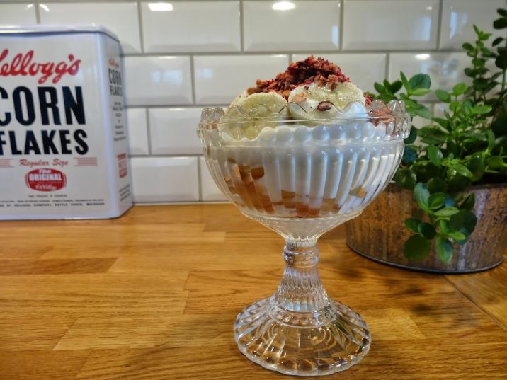 Jag började med att klicka i kvarg i botten av skålen. Fyllde sedan på med blandad frukt från en fruktsallad. Hällde på naturell yoghurt och skivade över banan.