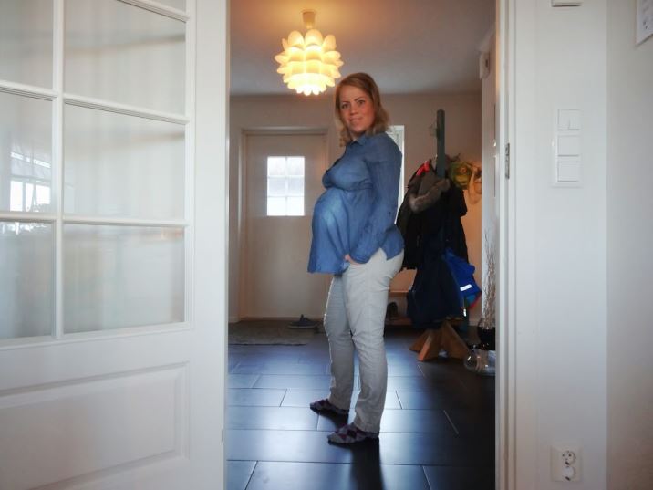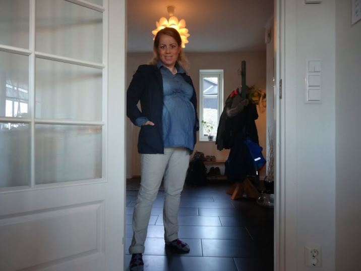 Så jag har köpt en del gravidkläder plus att jag hade kvar en del sedan förra graviditeten. Här har jag en jeansblå blus från H&M och beiga byxor, också därifrån. Kavajen är från MQ och inte gravidanpassad så det är inte direkt läge att knäppa den.