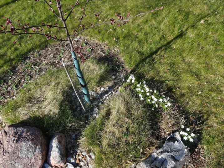 En del andra blommor har kommit upp på egen hand, som vitsipporna under körsbärsträdet, som nu lyser vita och fina i en klunga.